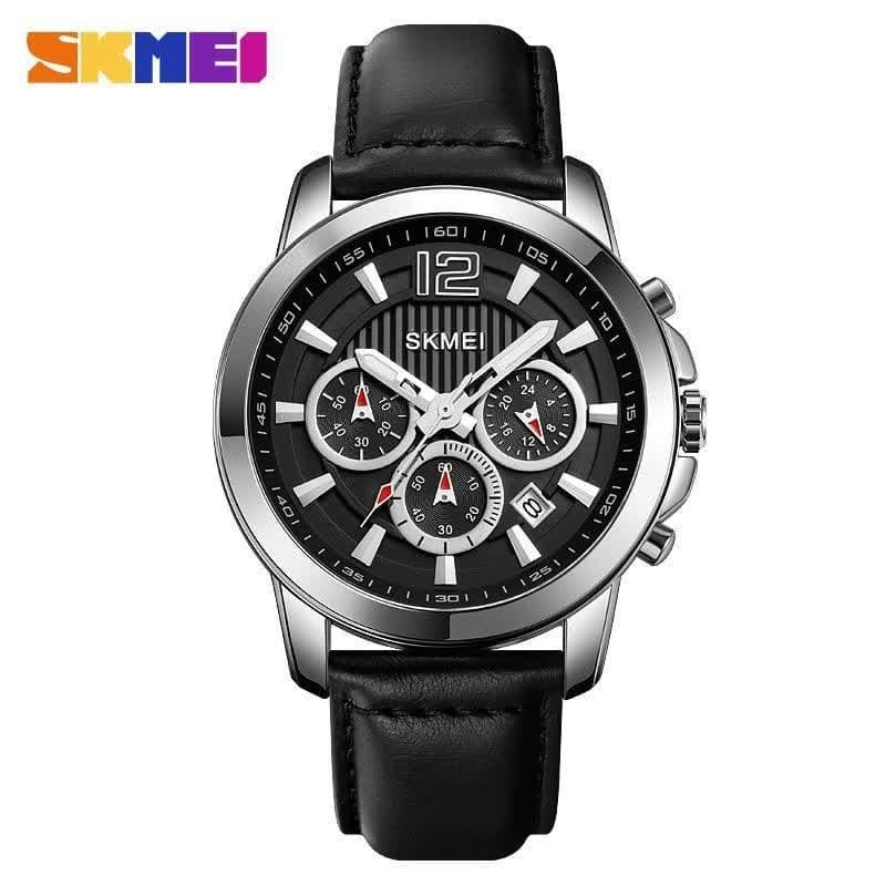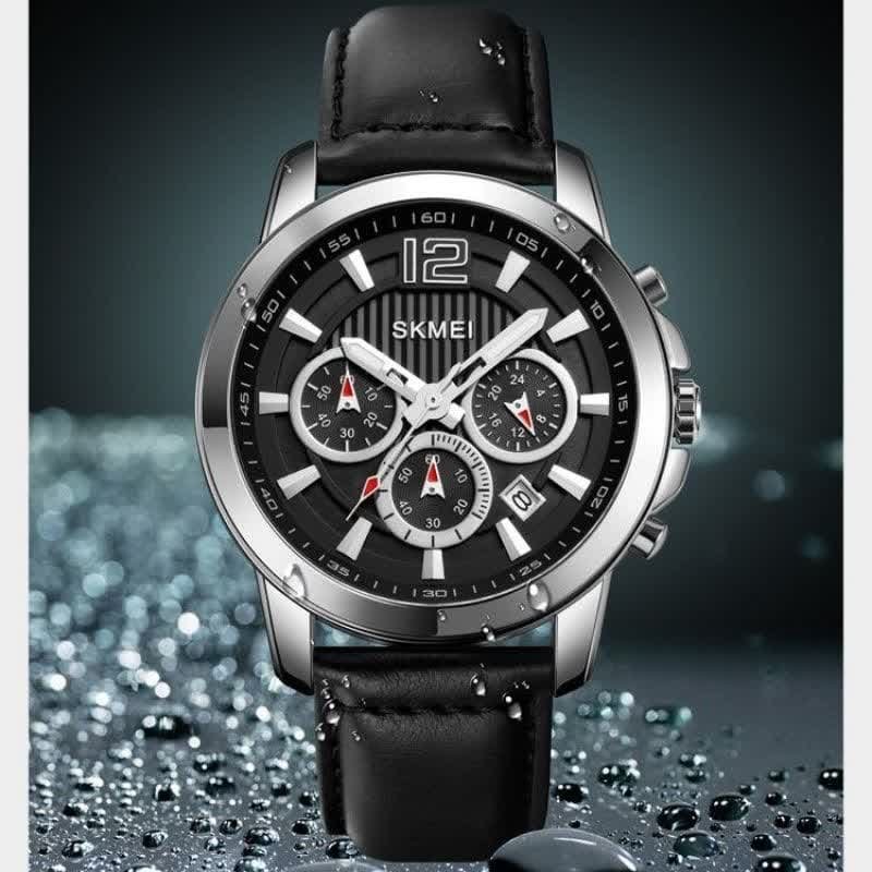 ساعت مچی مردانه اسکیمی کرنوگراف سه موتوره بند چرمی مشکی+باطری اضافی کد 3096