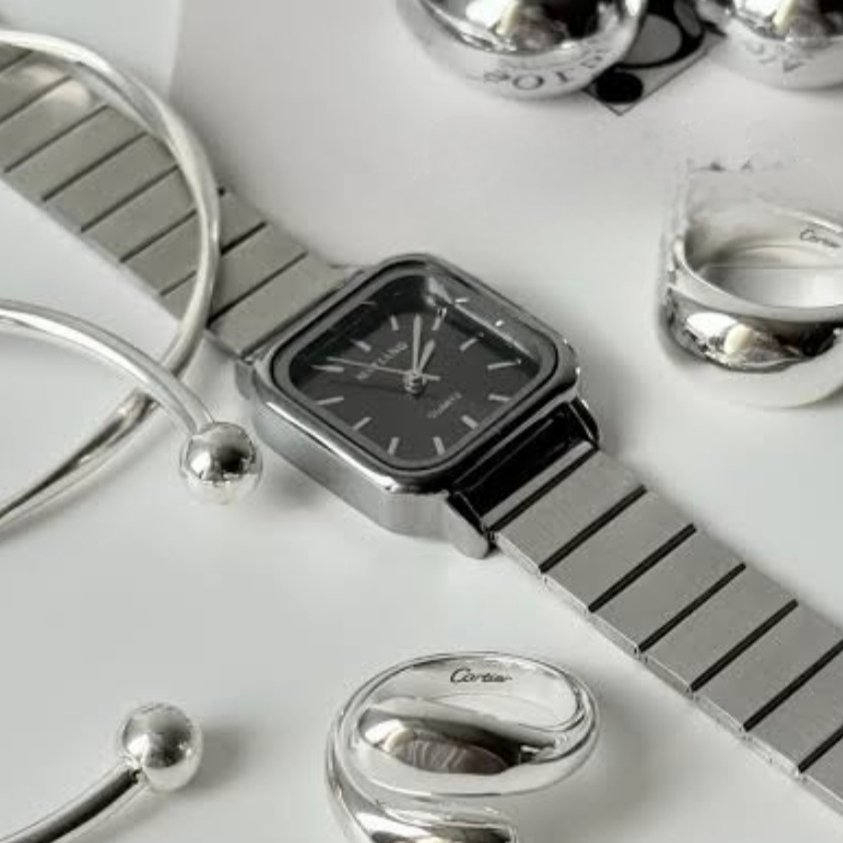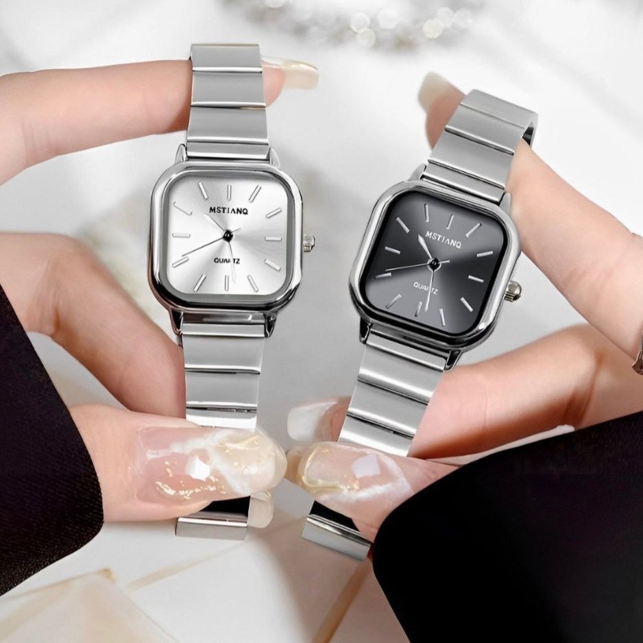 - ساعت مچی زنانه نایدو رنگ ثابت مکعبی شرکتی بند کرکره ایی استیل نقره ایی مشکی+باطری اضافی کد 2300