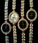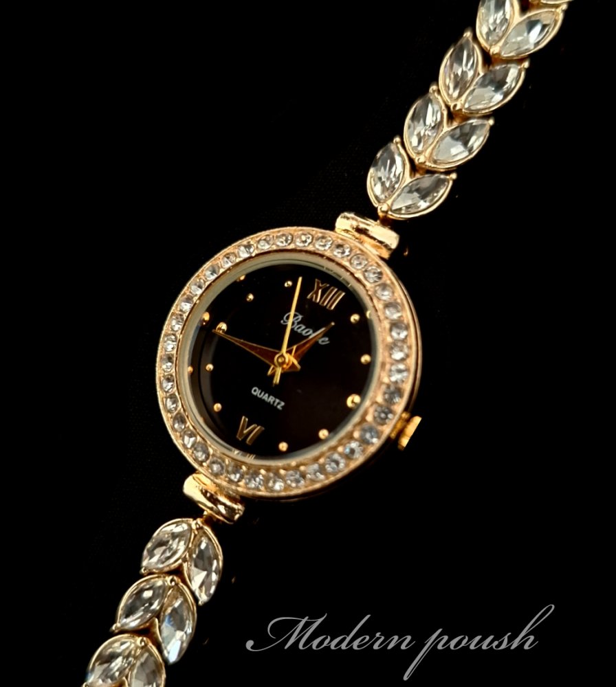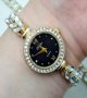 - ساعت مچی زنانه نگین دار طرح رویال کرون صفحه مشکی بند طلایی+باطری اضافی کد 2309