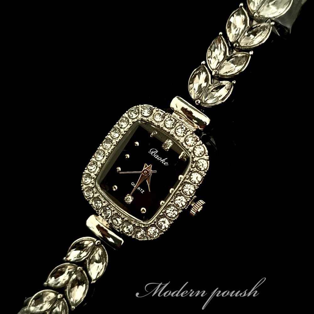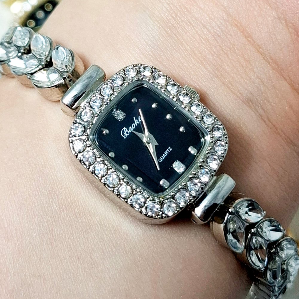 - ساعت مچی زنانه نگین دار طرح رویال کرون صفحه مستطیلی مشکی بندنقره ایی+باطری اضافی کد 2314