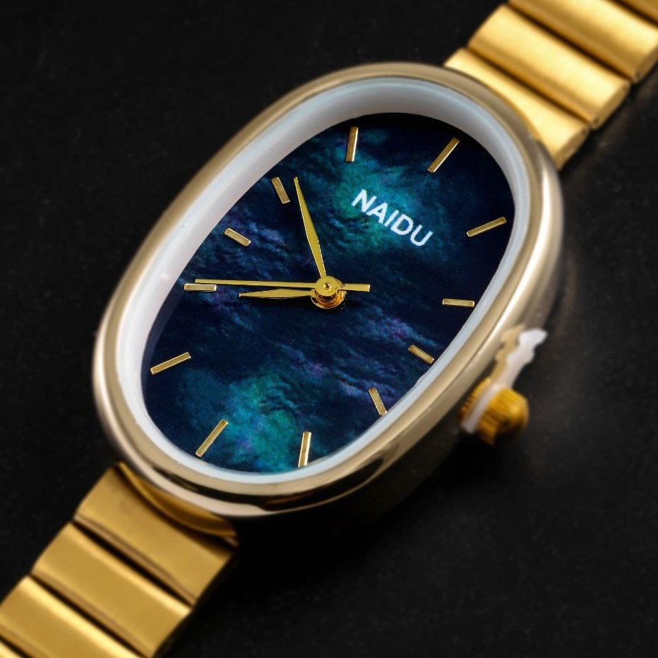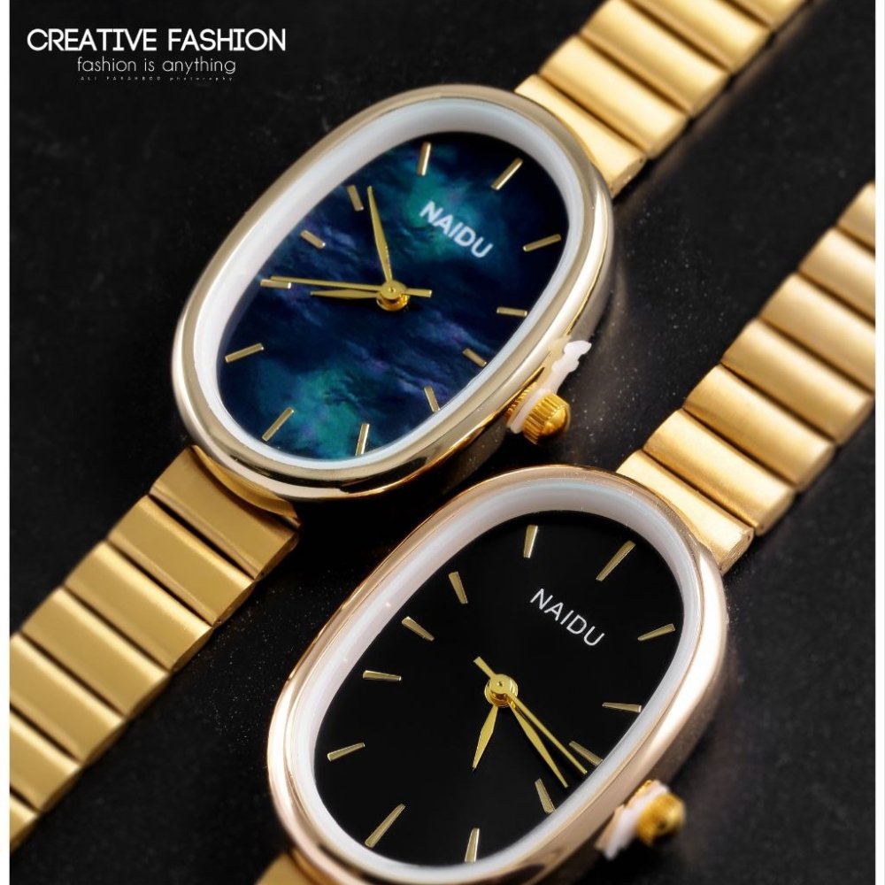- ساعت مچی زنانه بیضی بند استیل طلایی صفحه سورمه ایی نایدو NAIDU +باطری اضافی کد 2518