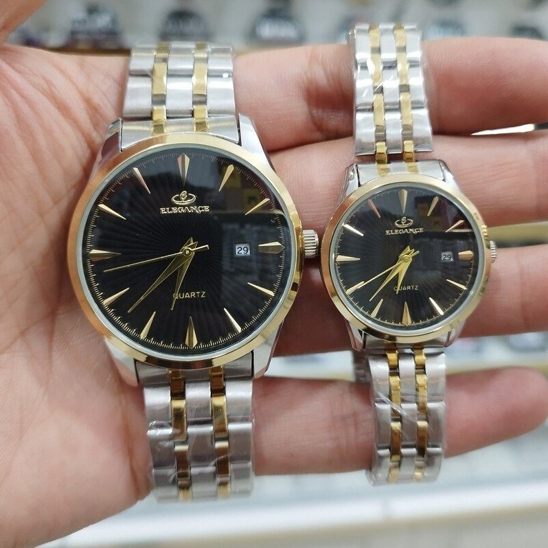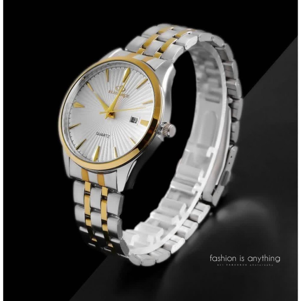 - ست ساعت مچی مردانه و زنانه الگانس صفحه سفید بند دو رنگ+باطری اضافی کد 2553