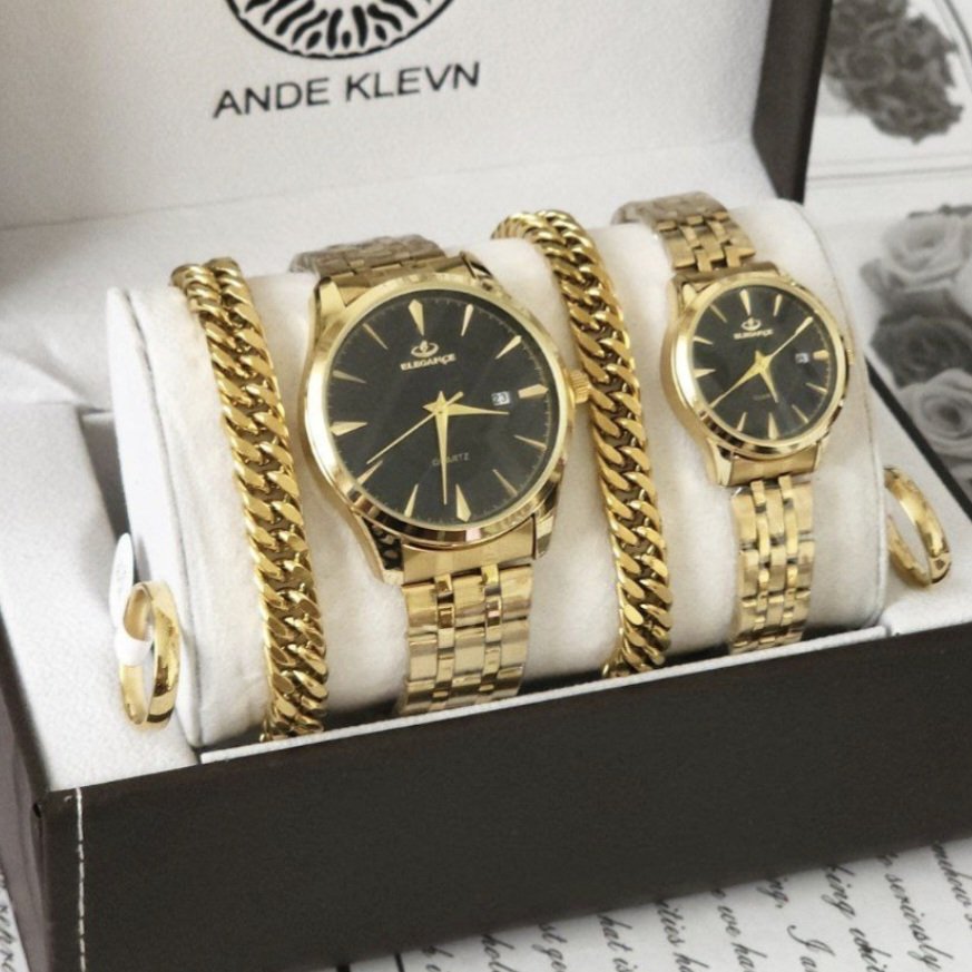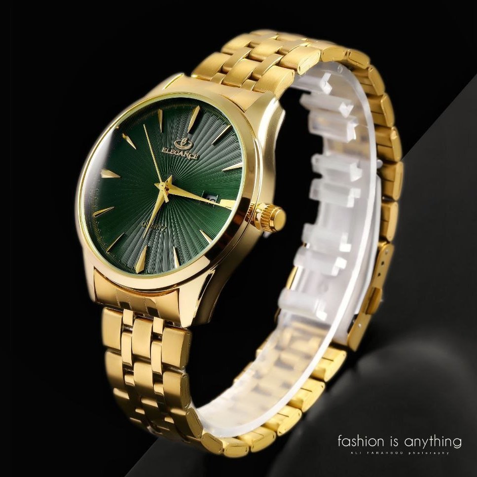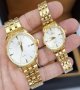 - ست ساعت مچی مردانه و زنانه الگانس صفحه سفید بند طلایی+باطری اضافی کد 2557