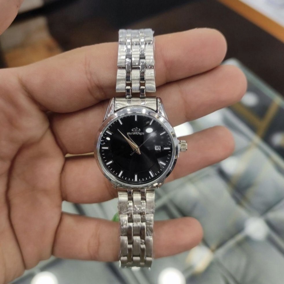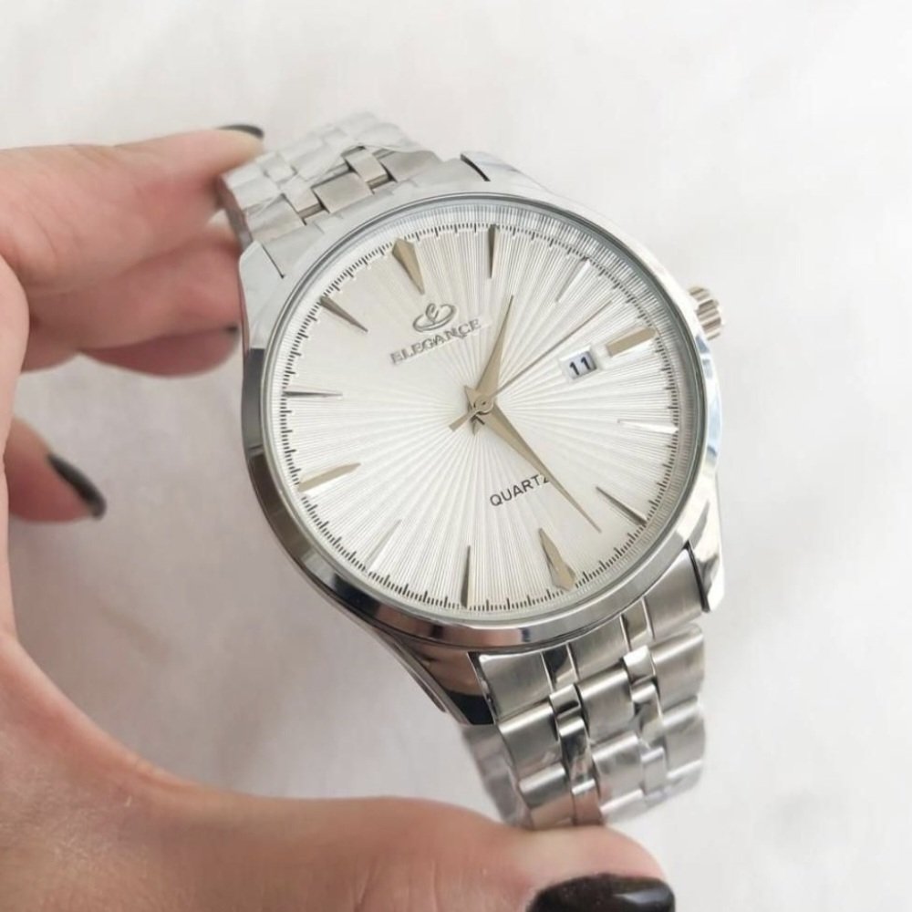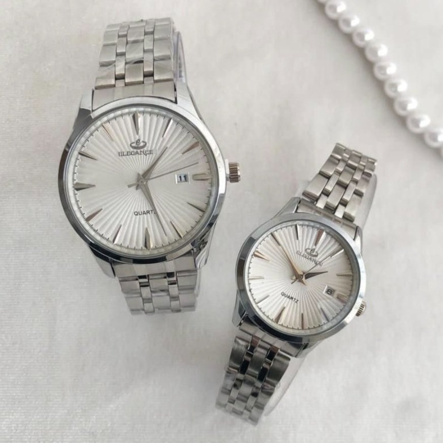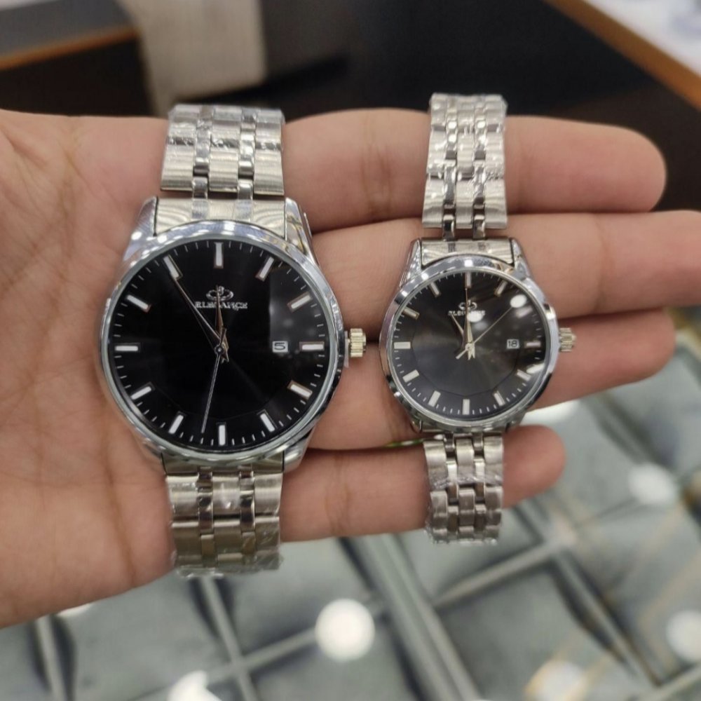 - ست ساعت مچی مردانه و زنانه الگانس صفحه مشکی بند نقره ایی+باطری اضافی کد 2569