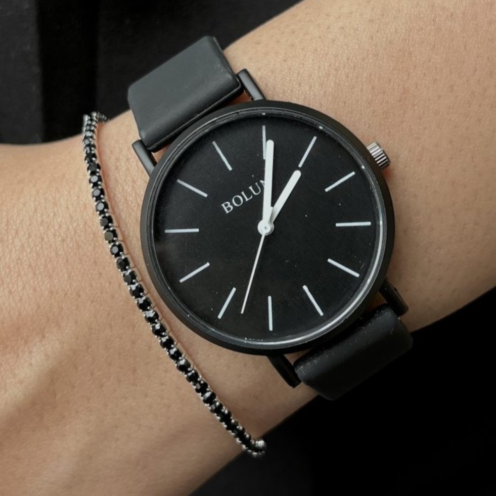 - ساعت مچی زنانه و دخترانه بلون BOLUN گرد بند سیلیکونی پاستیلی تمام مشکی+باطری اضافی کد 2611