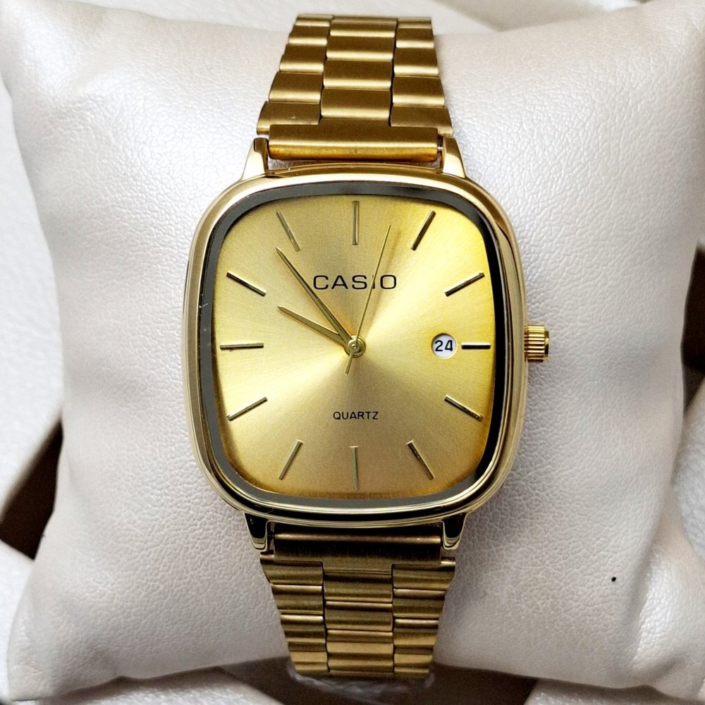 - ساعت مچی مردانه کاسیو صفحه مربعی طلایی بند استیل طلایی شیک+باطری اضافی کد2656