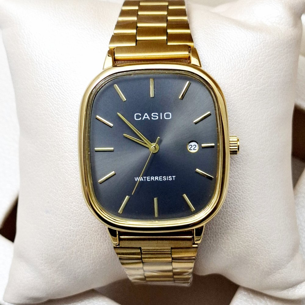 - ساعت مچی مردانه کاسیو صفحه مربعی مشکی بند استیل طلایی شیک+باطری اضافی کد2658