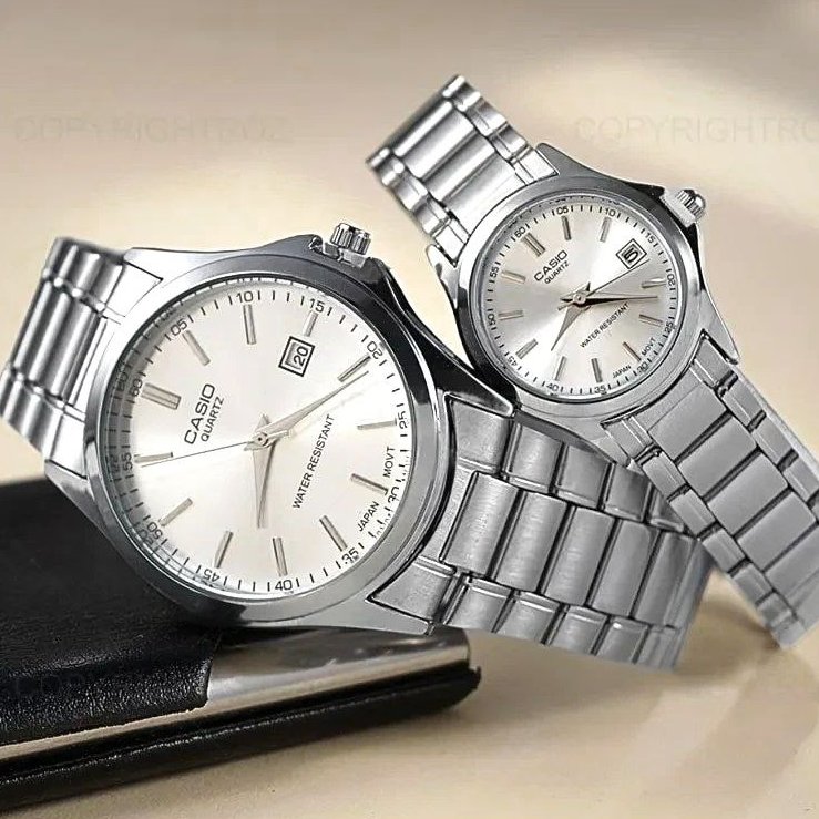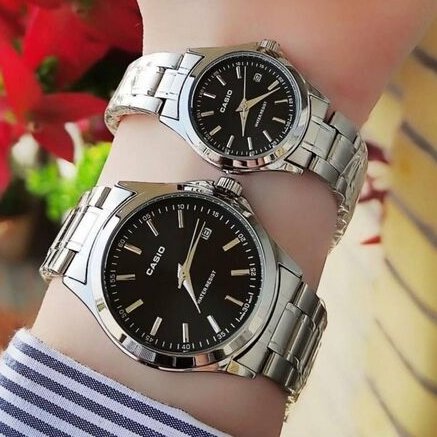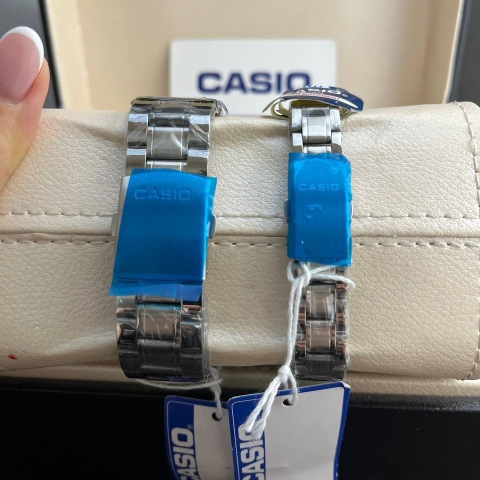 - ساعت ست و تکی زنانه و مردانه عقربه ای کاسیو CASIO صفحه گرد مشکی بند استیل نقره ایی+باطری اضافی - تک کد2720