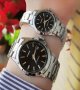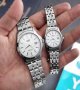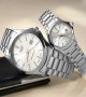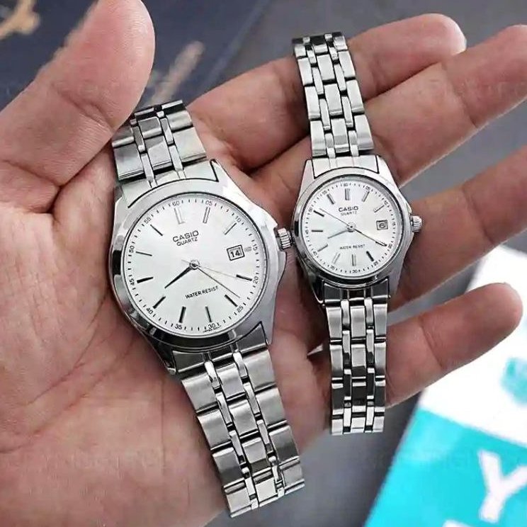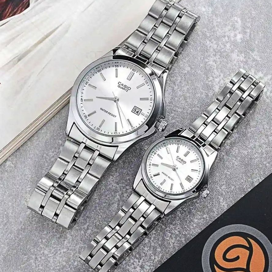ست ساعت مچی مردانه و زنانه عقربه ای کاسیو CASIO صفحه گرد سفید بند استیل نقره ایی+باطری اضافی - تک کد 2721