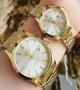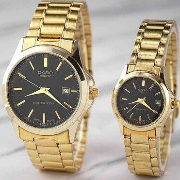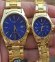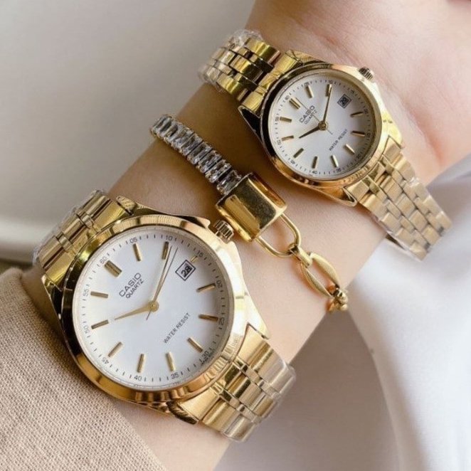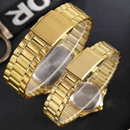 - ساعت ست و تکی زنانه و مردانه عقربه ای کاسیو CASIO صفحه گرد آبی بند استیل طلایی+باطری اضافی - تک کد 2725