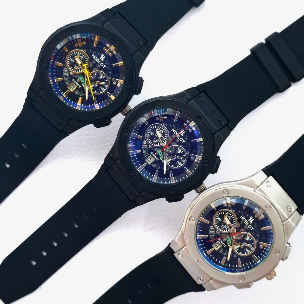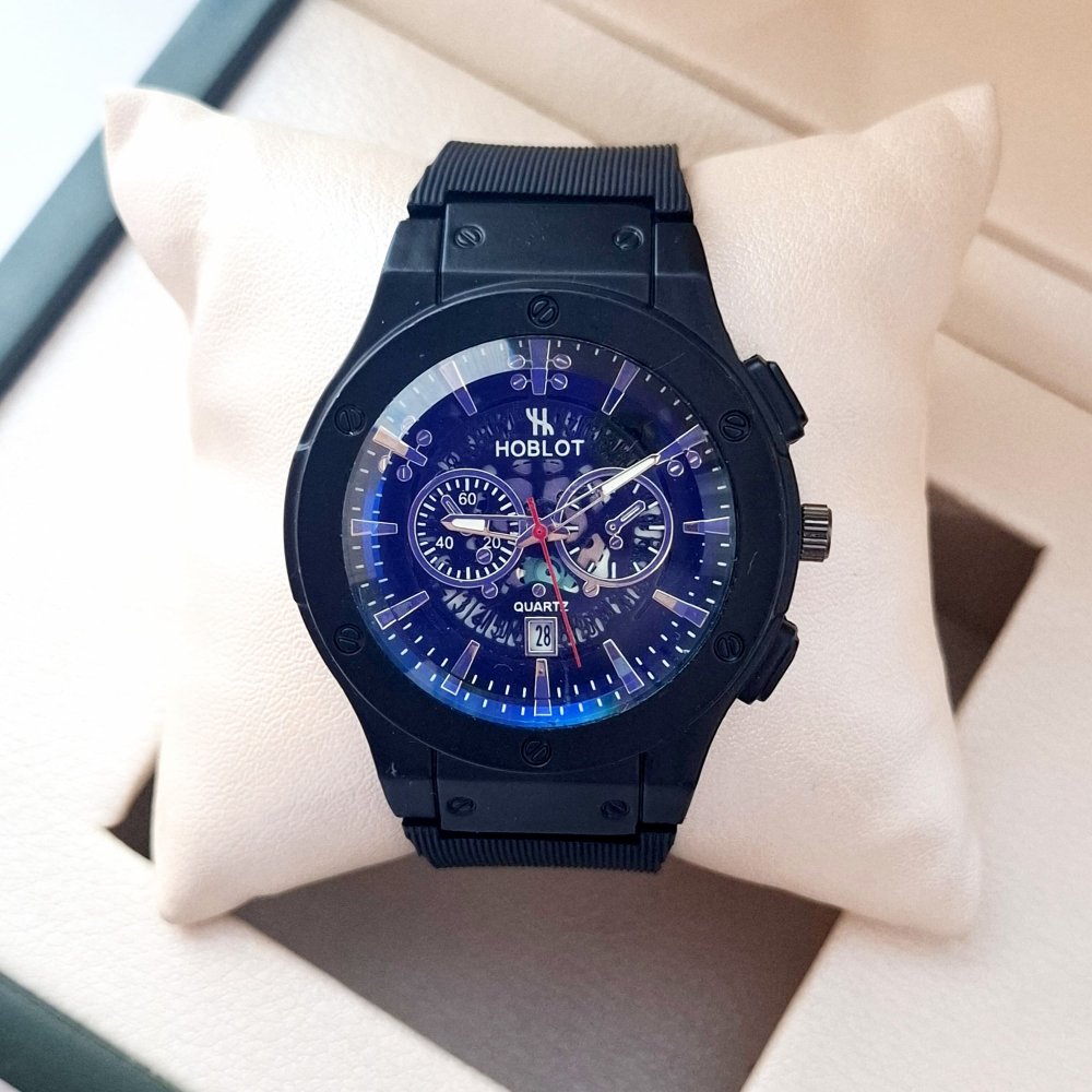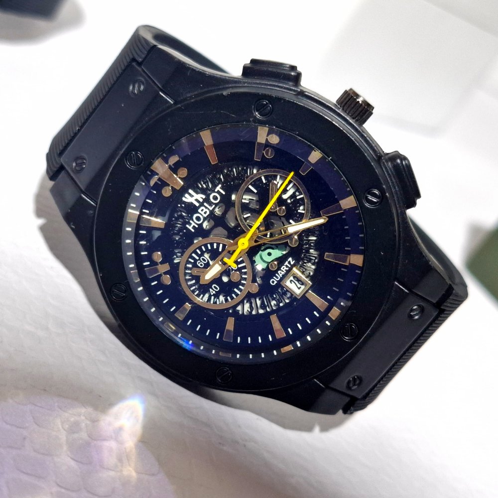 - ساعت مچی مردانه (پسرانه) هابلوت Hublot تقویم دار عقره ایی بند سیلیکات مشکی موتور نمایان طرح دو موتوره عقربه طلایی+باطری اضافی کد2738