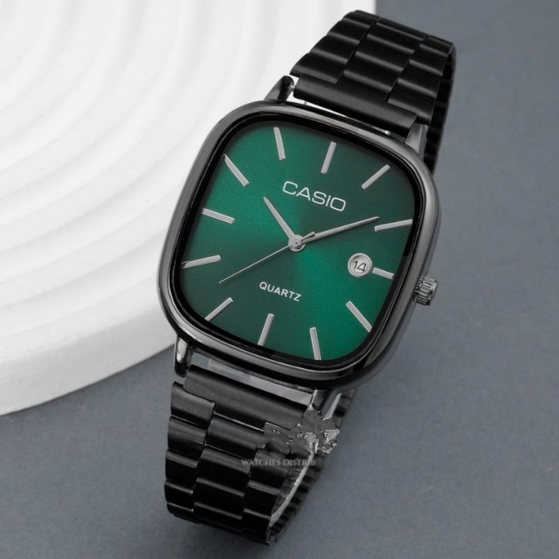 ساعت مچی مردانه کاسیو صفحه مربعی سبز بند مشکی استیل شیک و خاص پسند عقربه نقره ایی +باطری اضافی کد 2743