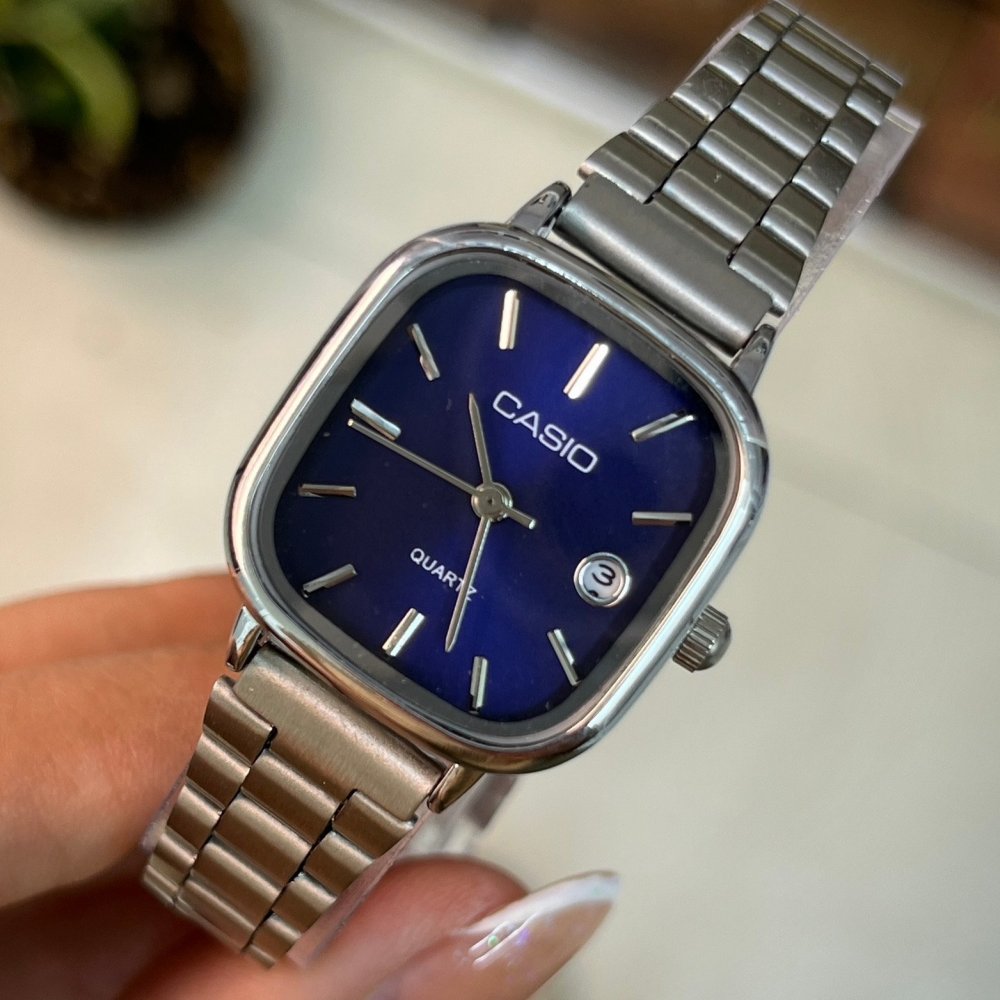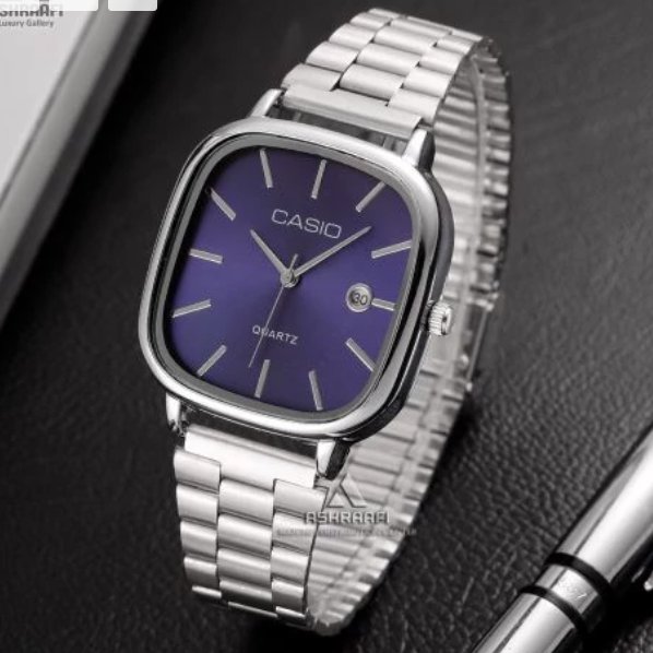 - ساعت مچی مردانه کاسیو صفحه مربعی سورمه ایی بند نقره ایی استیل شیک و خاص پسند عقربه نقره ایی ضدآب+باطری اضافی کد 2748