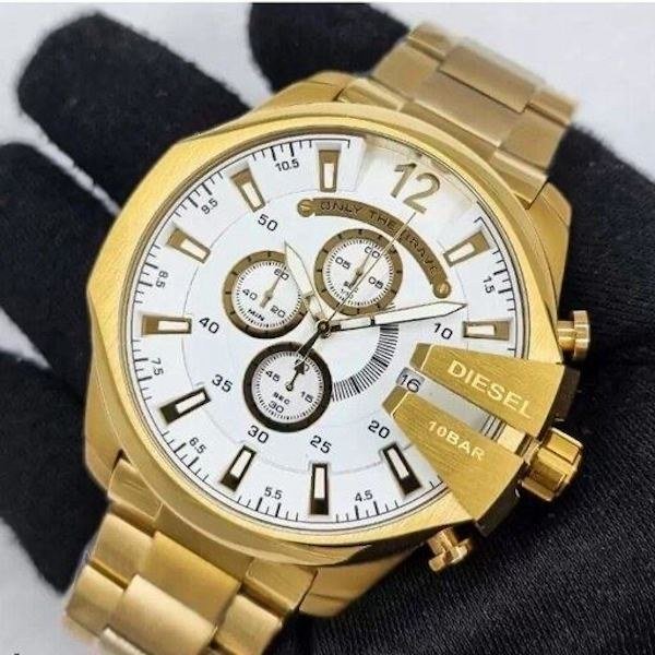 - ساعت دیزل حک مردانه بنداستیل طلایی صفحه سفید شاخ دار تقویم دار صفحه بزرگ حک برند دیزل+باطری اضافی کد 2753