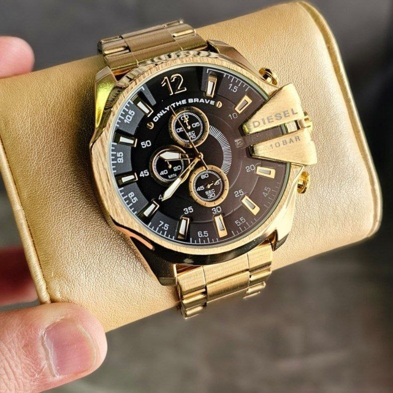 ساعت دیزل حک مردانه بنداستیل طلایی صفحه مشکی  شاخ دار تقویم دار حک برند دیزل +باطری اضافی کد 2754