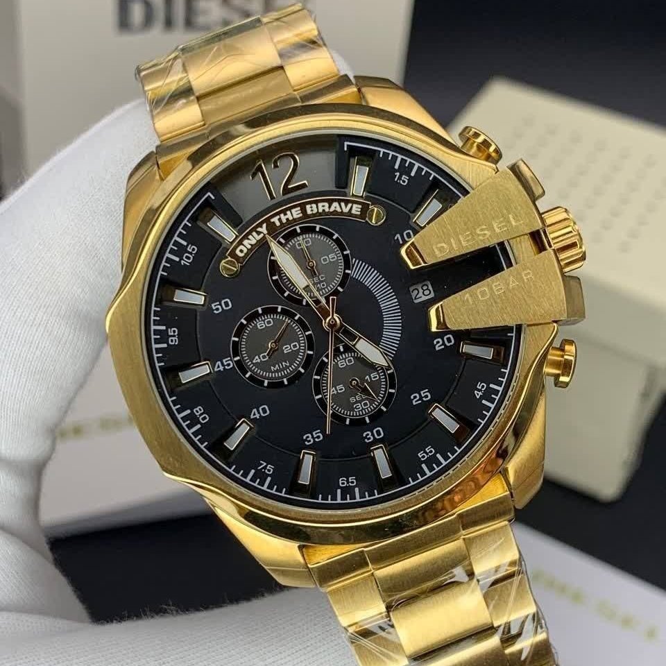 ساعت دیزل حک مردانه بنداستیل طلایی صفحه مشکی شاخ دار تقویم دار حک برند دیزل +باطری اضافی کد 2754