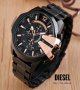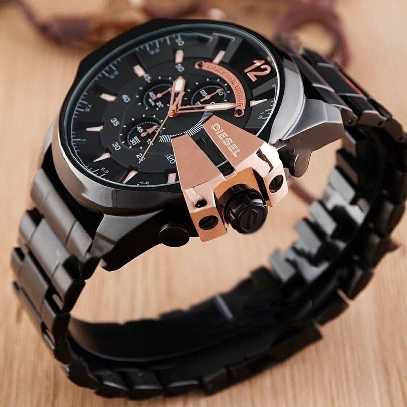 ساعت دیزل حک مردانه بنداستیل مشکی صفحه مشکی شاخ دار تقویم دار حک برند دیزل شاخ رزگلد+باطری اضافی کد 2756