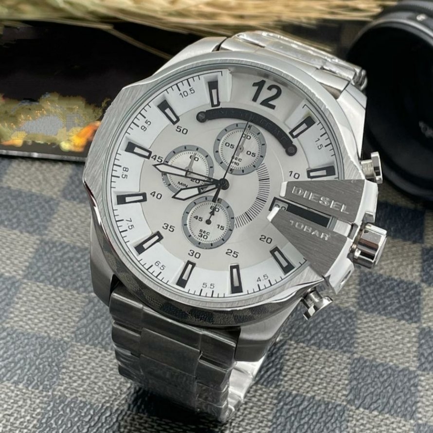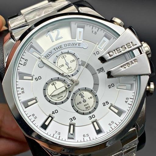 - ساعت دیزل حک مردانه بنداستیل نقره ایی صفحه سفید شاخ دار تقویم دار حک برند دیزل+باطری اضافی کد 2759