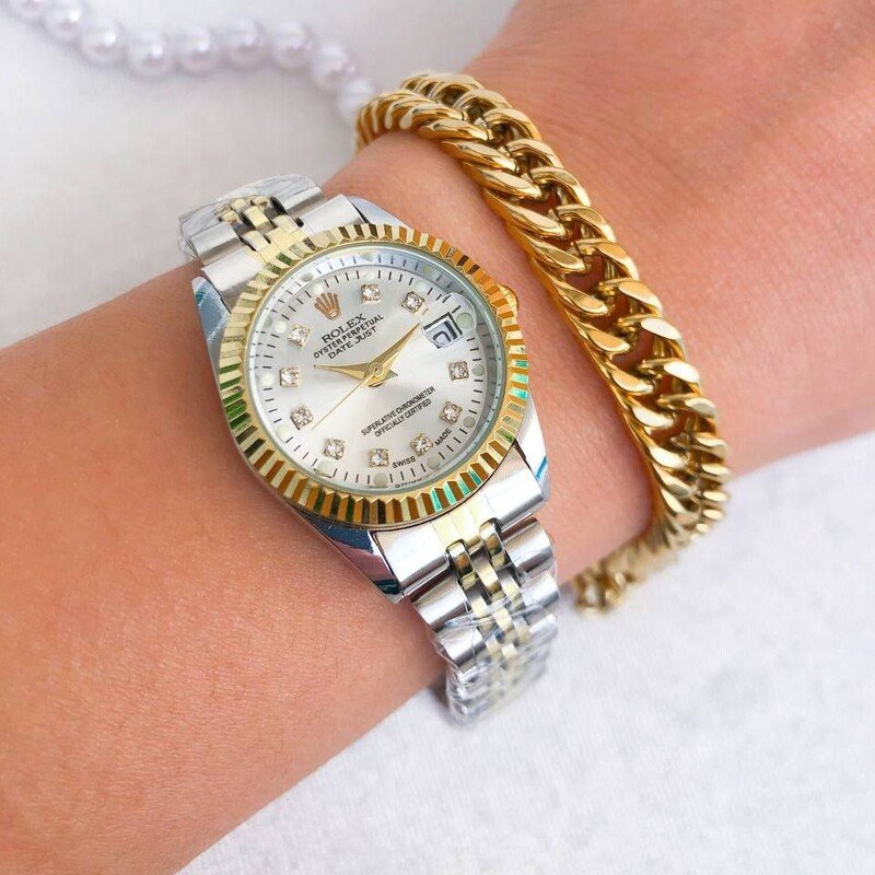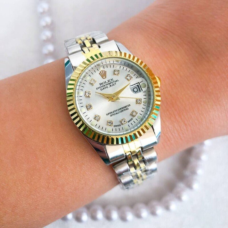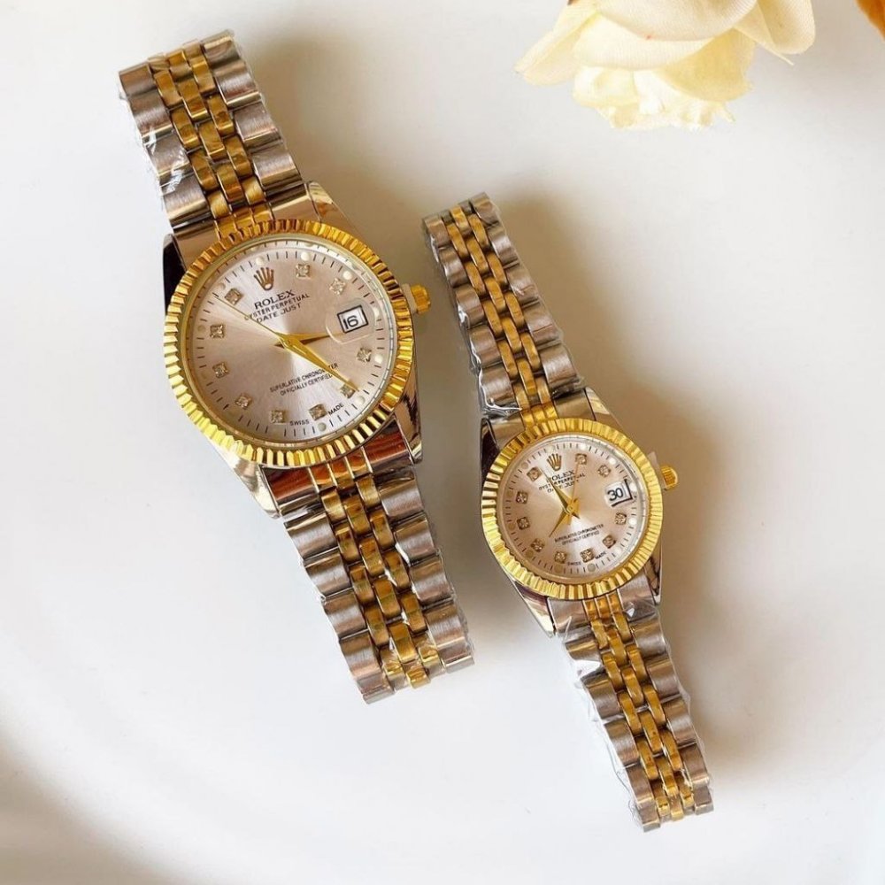 - ست ساعت رولکس زنانه مردانه دیت جاست بند نقره ای طلایی صفحه سفید ضد آب شیک+باطری اضافی کد 2847