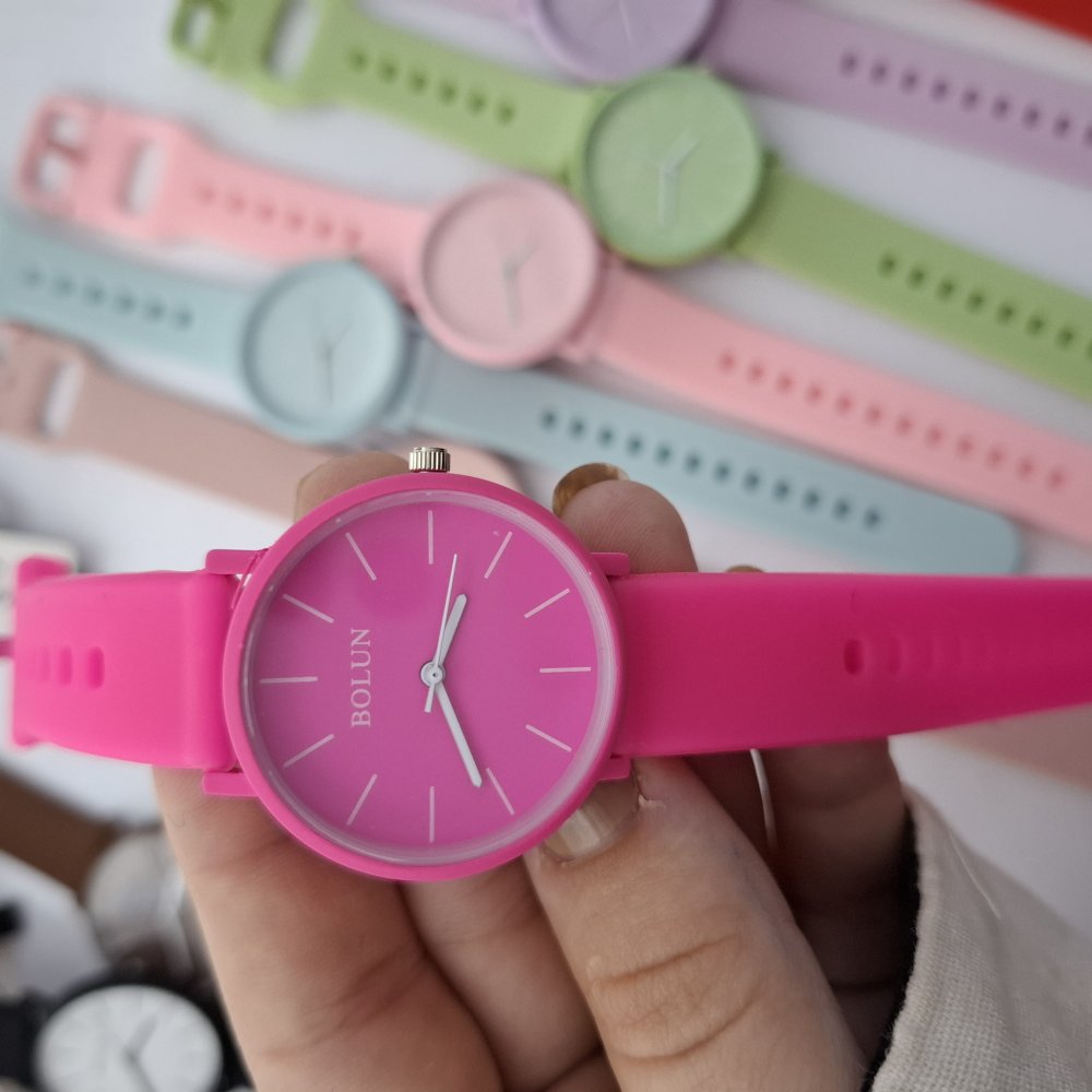 - ساعت مچی زنانه و دخترانه بلون BOLUN گرد بند سیلیکونی پاستیلی صورتی جیغ+باطری اضافی کد 2850