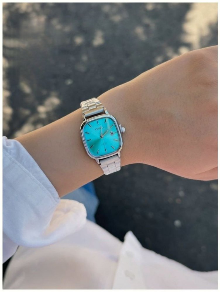 ساعت مچی زنانه کاسیو صفحه مربعی آبی بند نقره ایی استیل شیک و خاص پسند عقربه نقره ایی ضدآب+باطری اضافی کد 2872