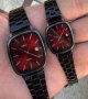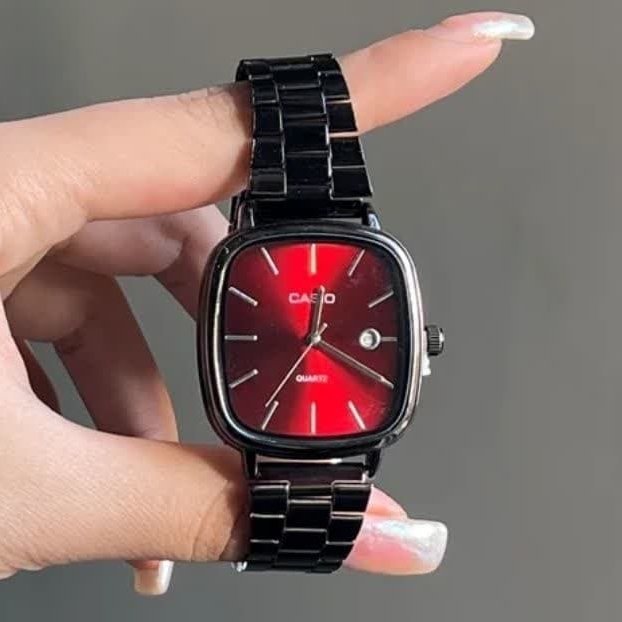- ست ساعت مچی مردانه و زنانه کاسیو صفحه مربعی زرشکی(قرمز) بند نقره ایی استیل شیک و خاص پسند عقربه نقره ایی ضدآب+باطری اضافی کد 2876