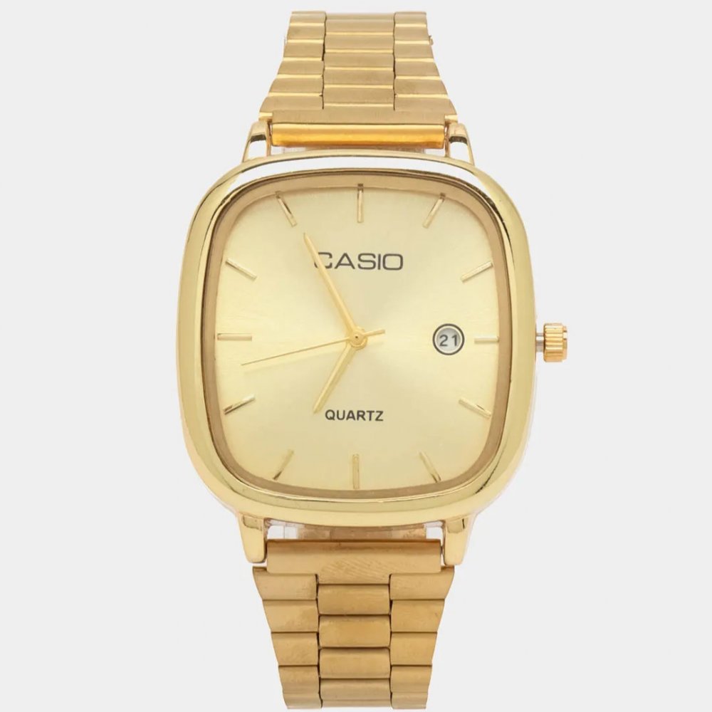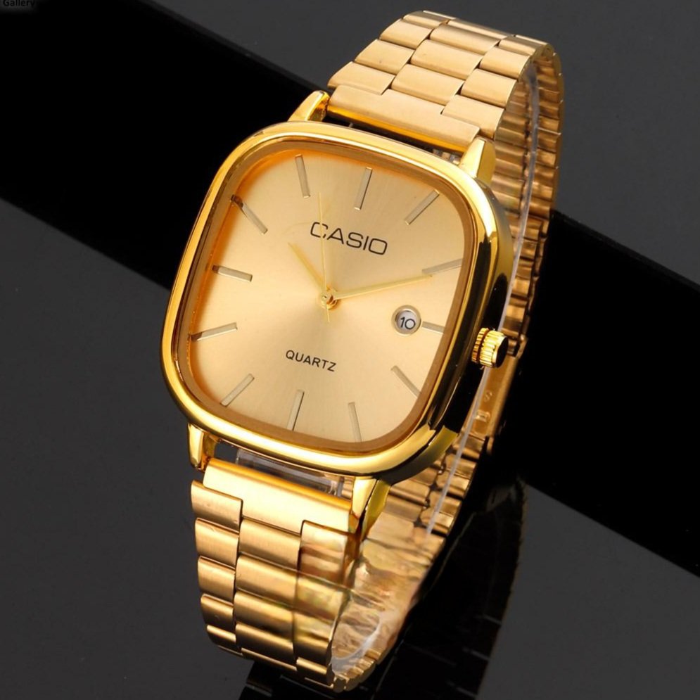 - ساعت مچی مردانه کاسیو صفحه مربعی طلایی بند طلایی استیل شیک و خاص پسند ضدآب +باطری اضافی کد 2890