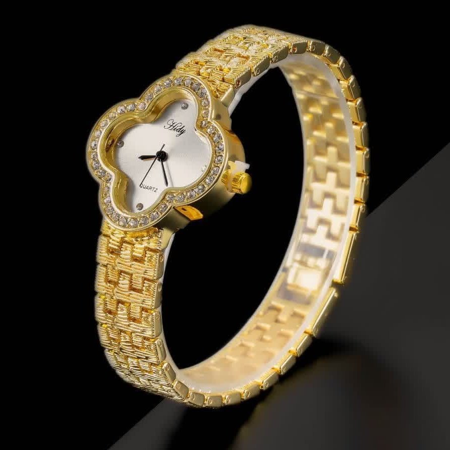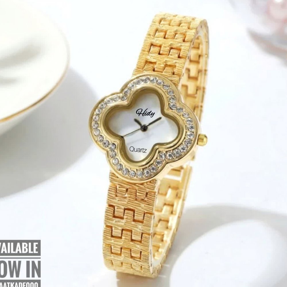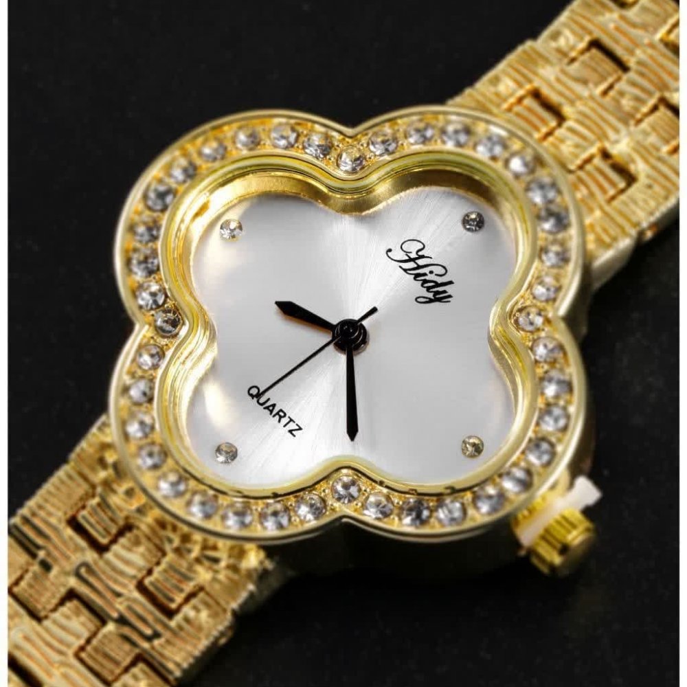 - ساعت مچی زنانه HIDY قاب فول نگین طرح گل طلایی ضد آب خوش دست مجلسی شیک و جدید+باطری اضافی کد2892