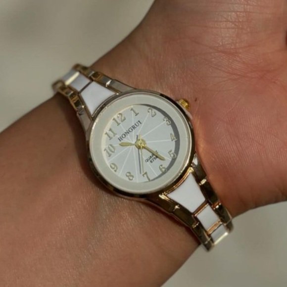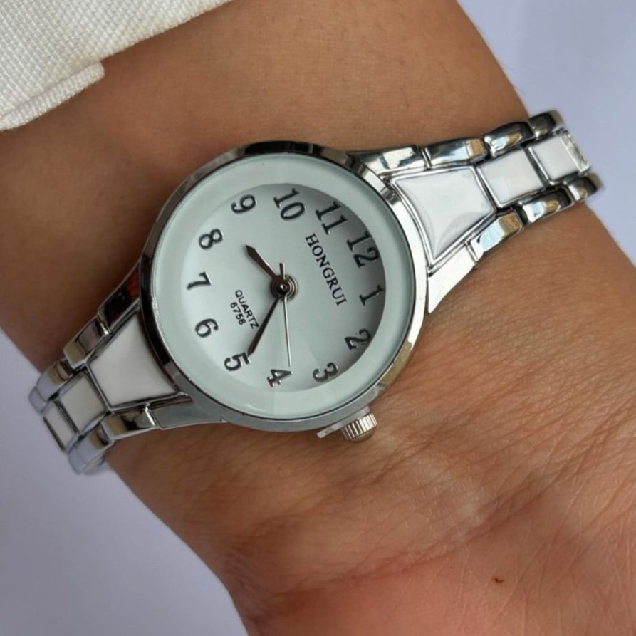 - ساعت زنانه هانگری طرح سرامیکی نقره ایی صفحه سفید+باطری اضافی کد 2896