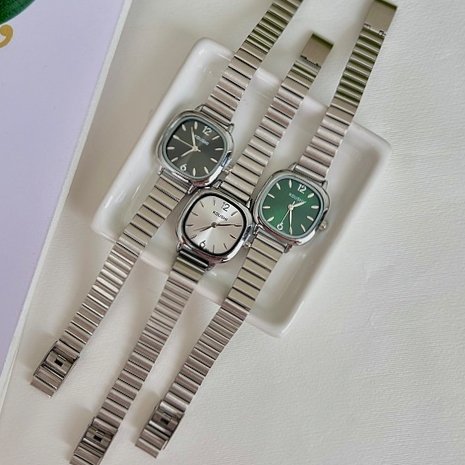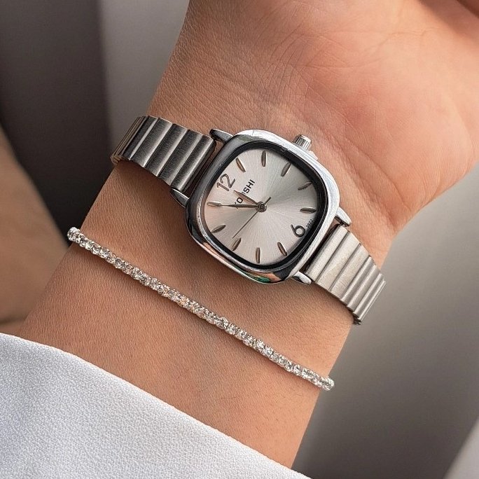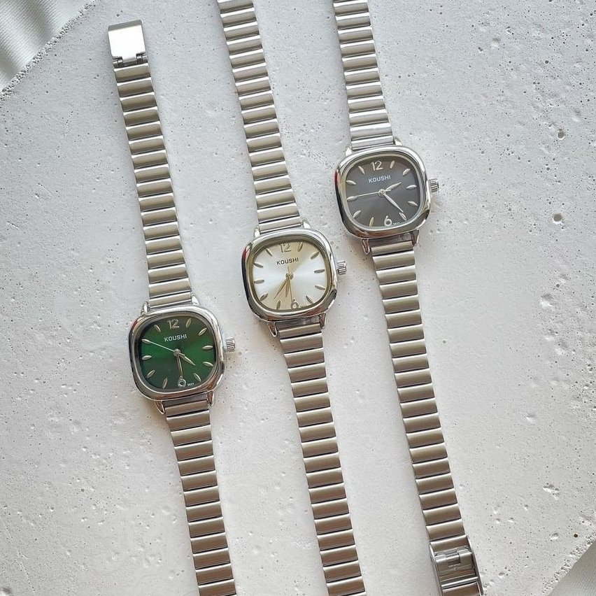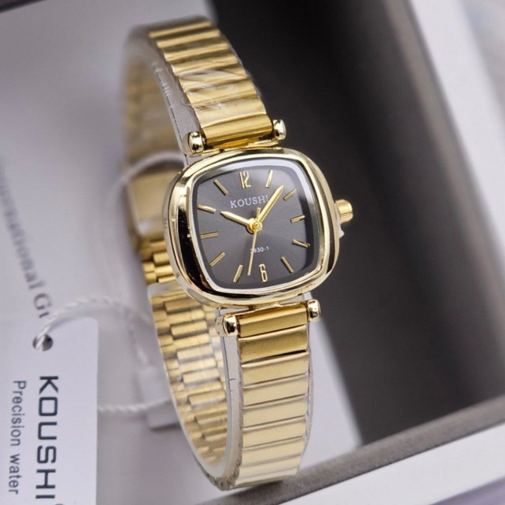 - ساعت مچی زنانه و دخترانه کوشی Koushi صفحه مربع مشکی بند کرکره ایی استیل نقره ایی ضدآب+باطری اضافی کد2947