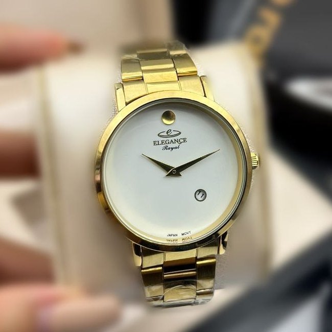 - ساعت مچی مردانه و زنانه ELEGANCE الگانس رایال بند استیل طلایی صفحه نمایش گرد سفید+باطری اضافی کد 2964
