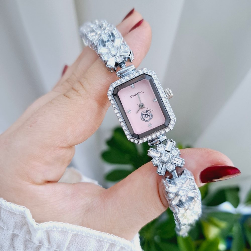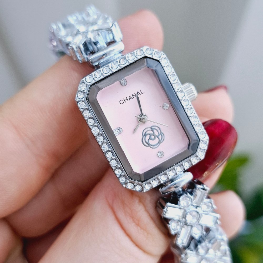 - ساعت مچی زنانه نگین دار چنل CHANAL دستبندی صفحه مستطیلی صورتی+باطری اضافی کد 3110