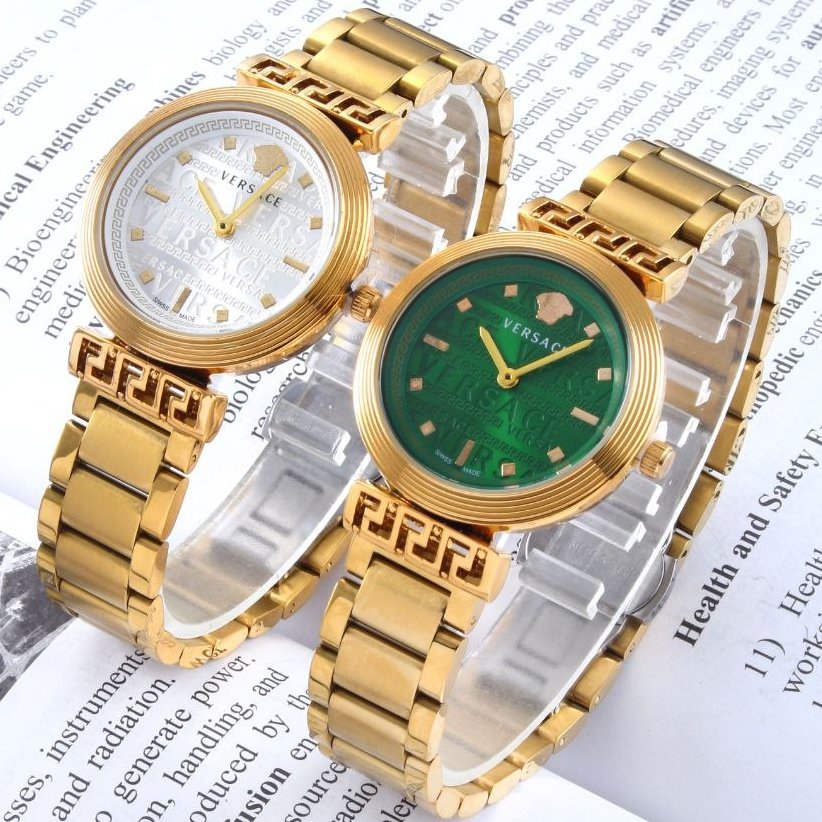 - ساعت مچی زنانه برند ورساچه Versace شیشه کریستال بند استیل طلایی صفحه نمایش گرد سفید+باطری اضافی کد 3123