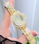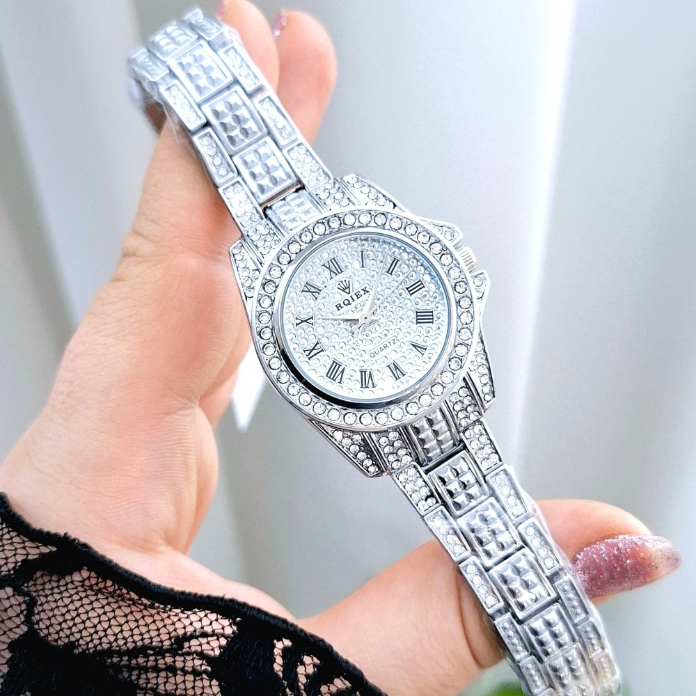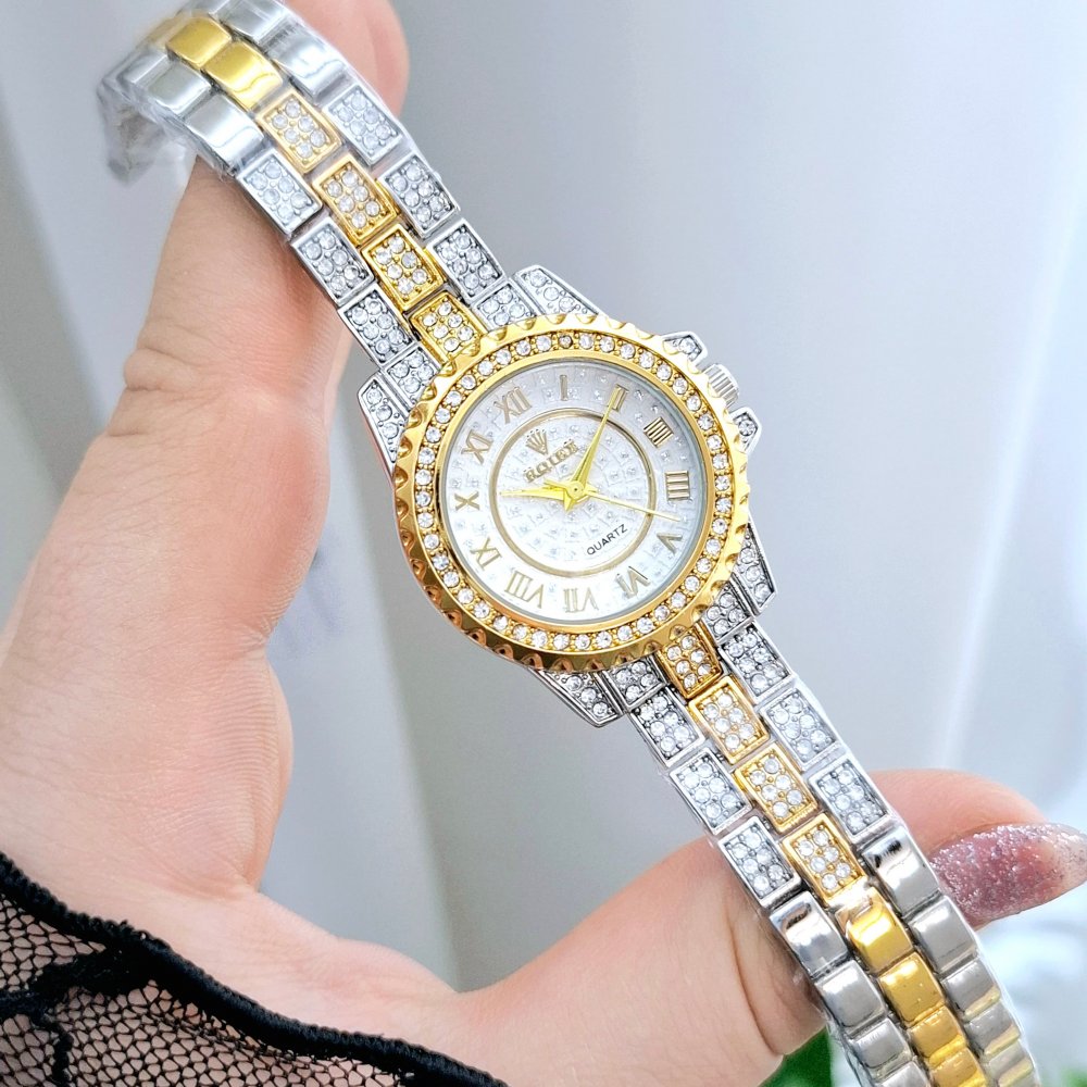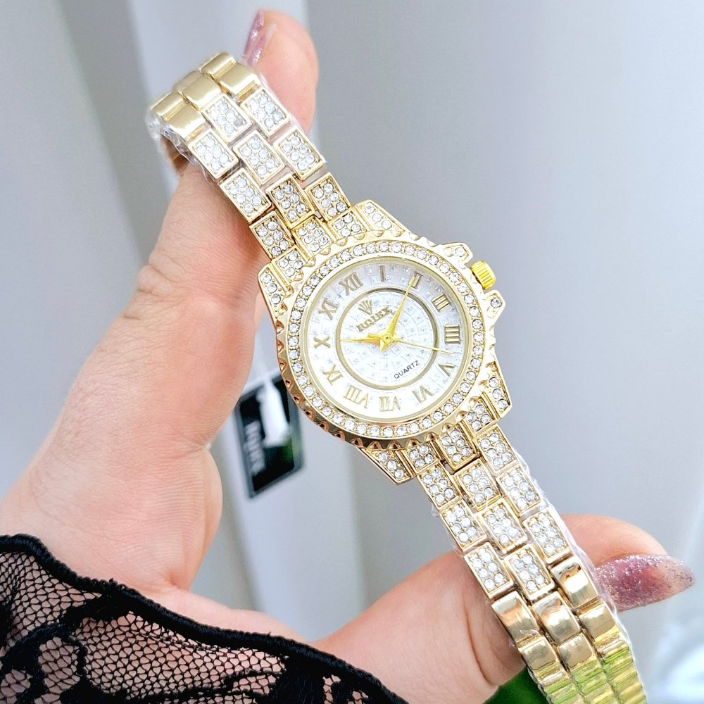 - ساعت مچی زنانه فول نگین ROLEX رولکس بند استیل طلایی دو رنگ صفحه نمایش گرد سفید مجلسی شیک و جدید+باطری اضافی کد 3156