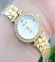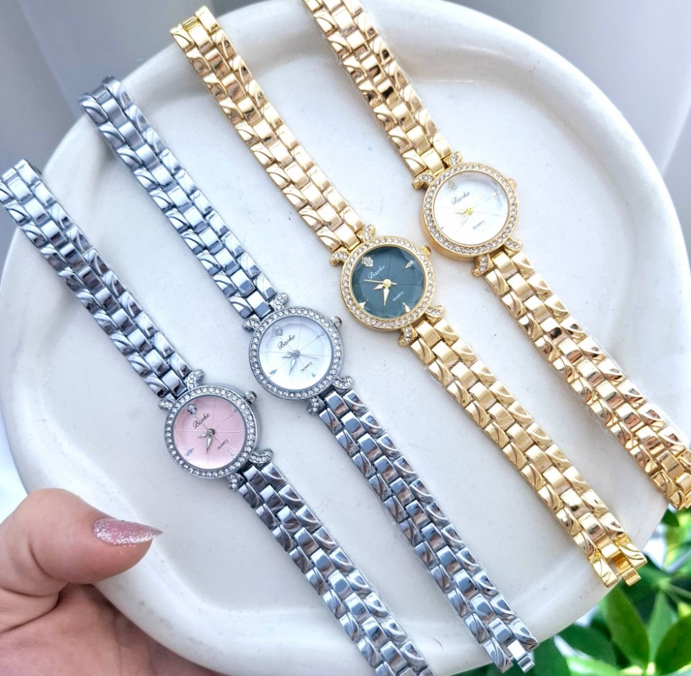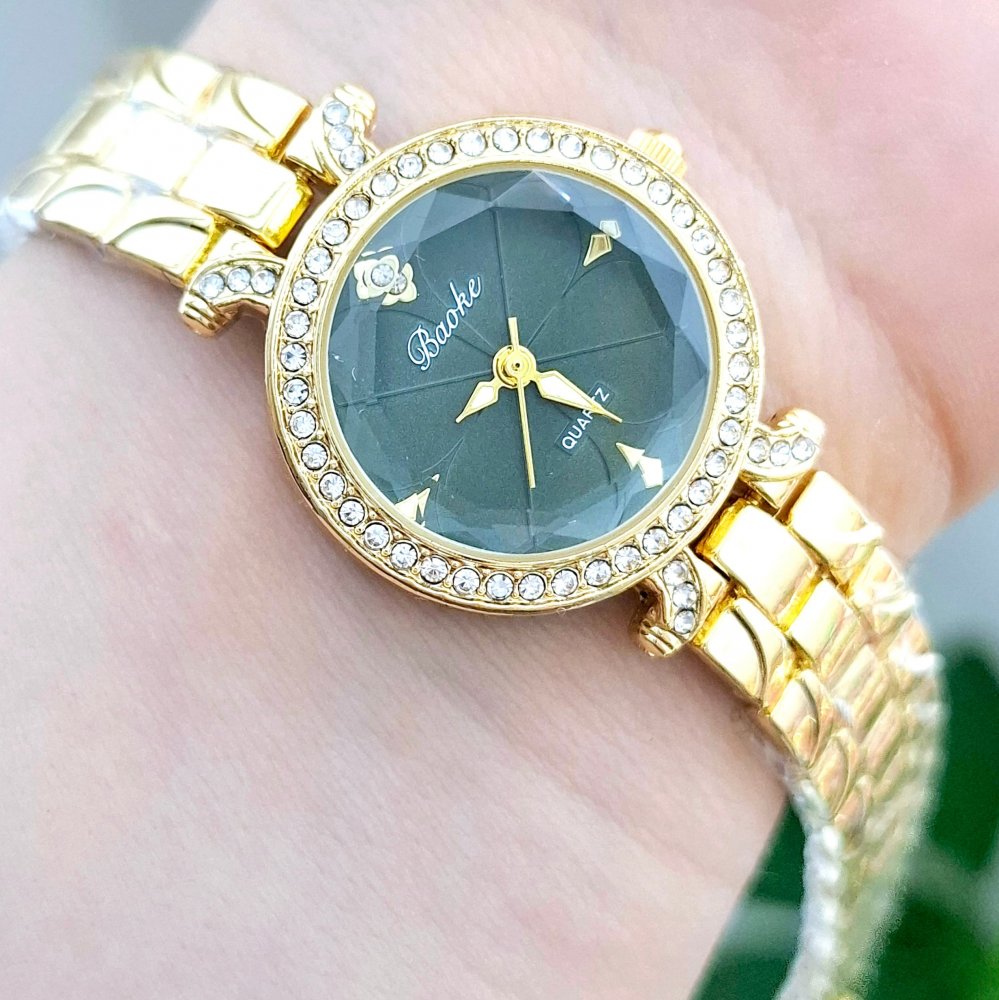 - ساعت مچی زنانه BAOKباعوک نگین دار بند استیل طلایی صفحه نمایش گرد سفید شیسه الماسی مجلسی-جدید کد 3161