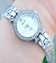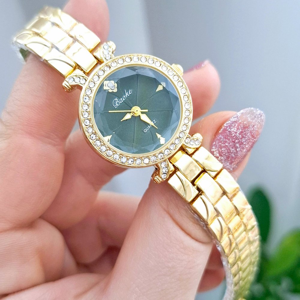 - ساعت مچی زنانه BAOKباعوک نگین دار بند استیل طلایی صفحه نمایش گرد سبز شیسه الماسی مجلسی-جدید+باطری اضافی کد 3162