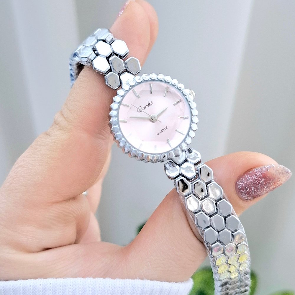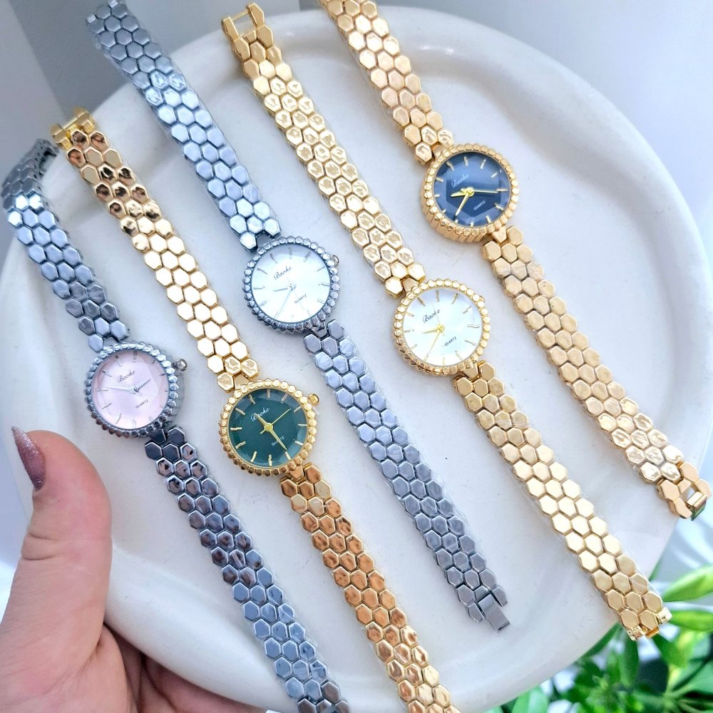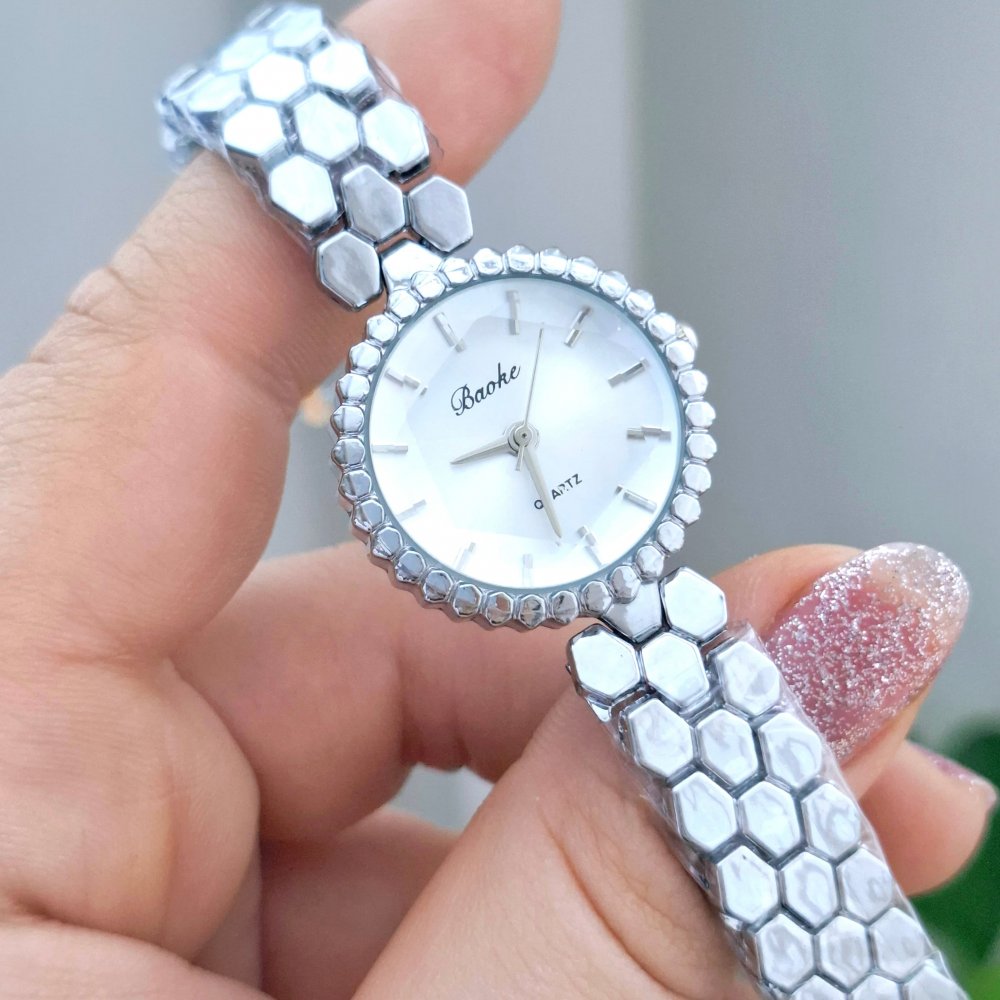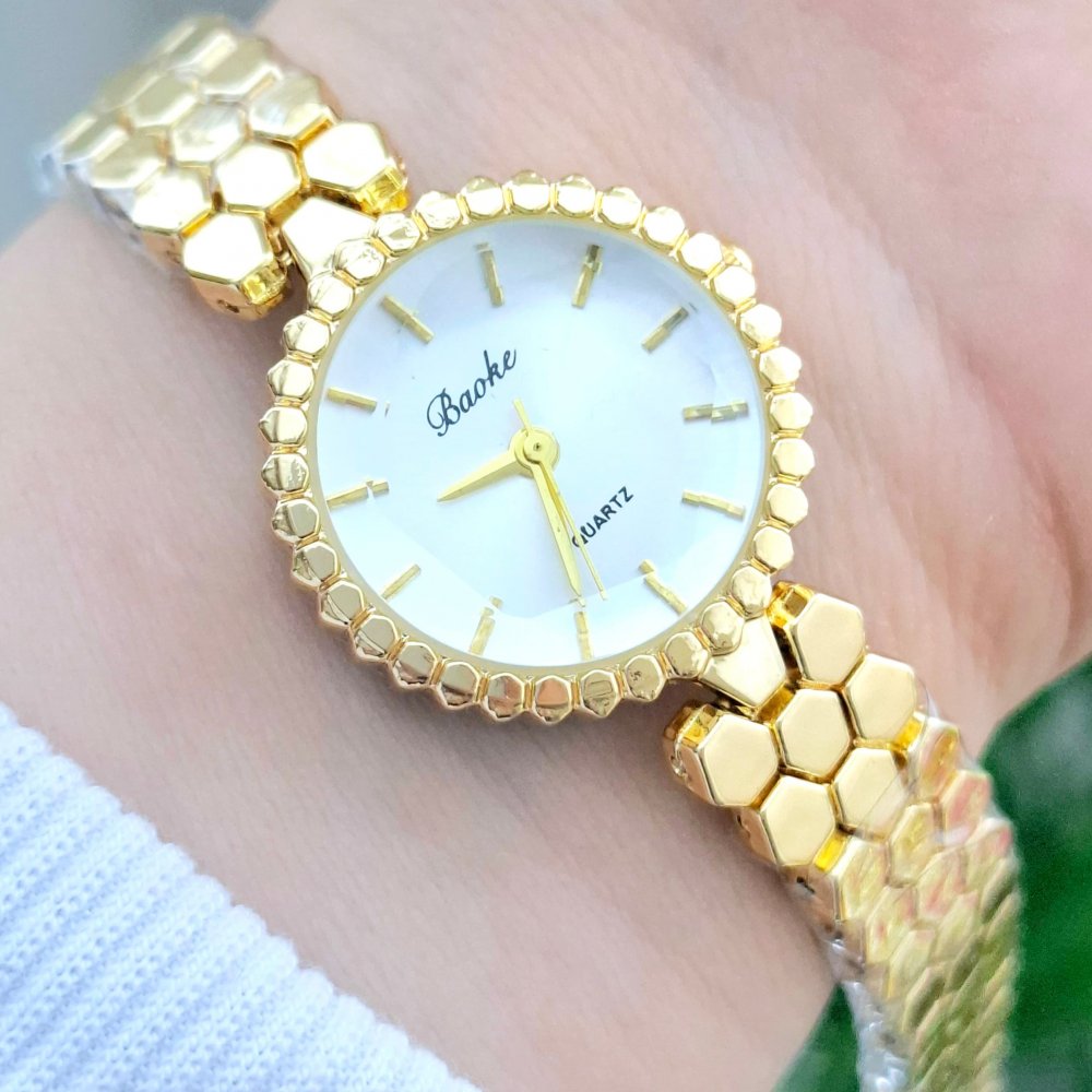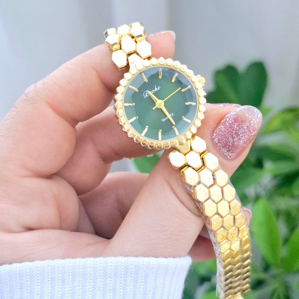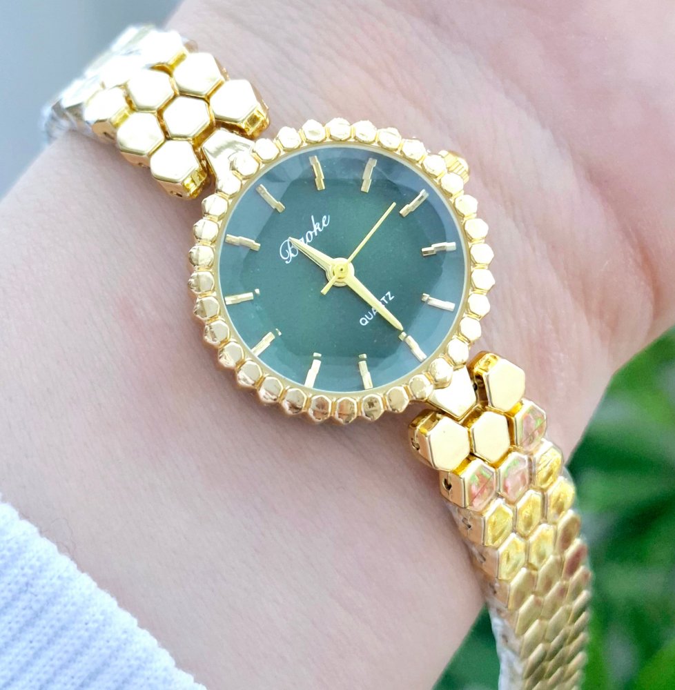 - ساعت مچی زنانه BAOKباعوک نگین دار بند استیل طلایی صفحه نمایش گرد سبز شیسه الماسی مجلسی-جدید+باطری اضافی کد3167