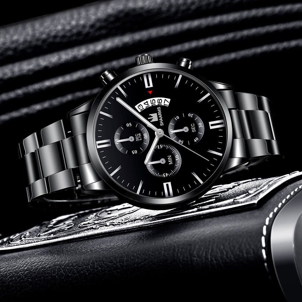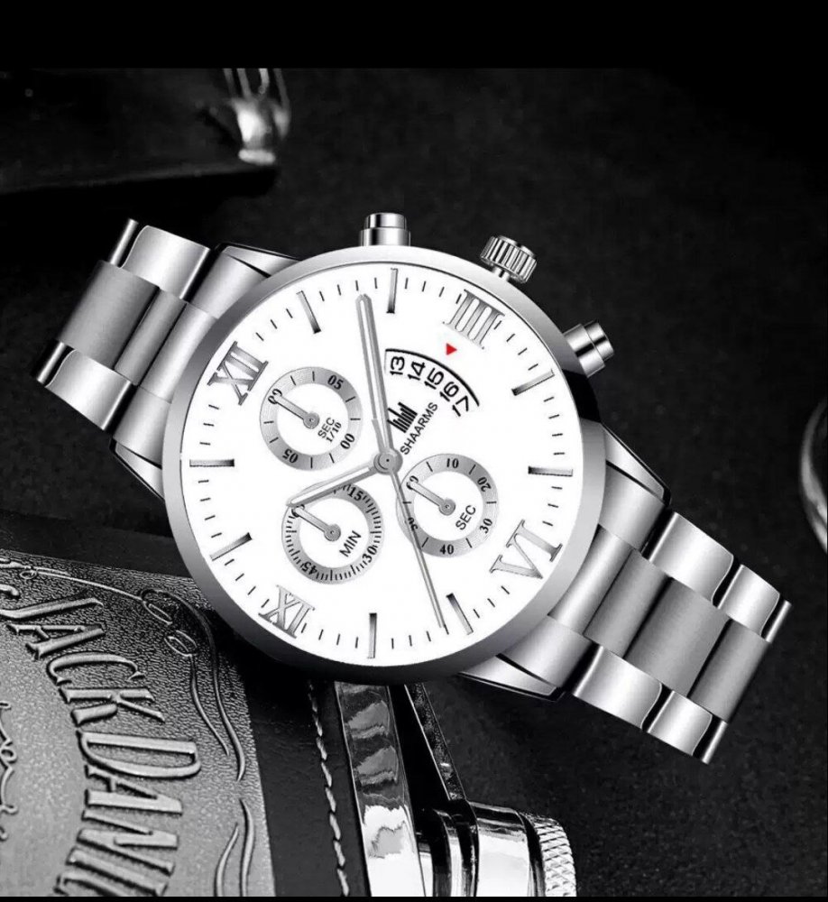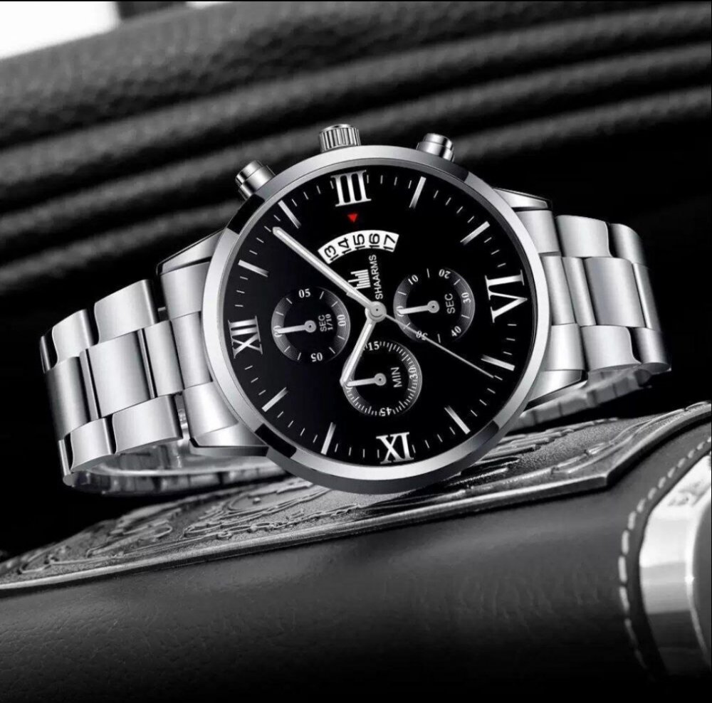 - ساعت مچی مردانه شرکتی بند استیل طلایی طرح 3 موتوره shaarms کرنو صفحه نمایش گرد مشکی +باطری اضافی کد9069