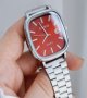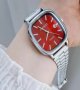 ساعت مچی مردانه کاسیو صفحه مربعی قرمز(آلبالویی)  بند استیل نقره ایی شیک و خاص پسند عقربه نقره ایی ضدآب+باطری اضافی کد 9087