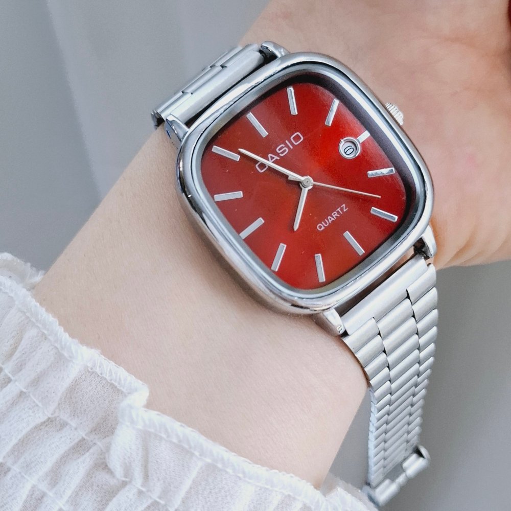 ساعت مچی مردانه کاسیو صفحه مربعی قرمز(آلبالویی) بند استیل نقره ایی شیک و خاص پسند عقربه نقره ایی ضدآب+باطری اضافی کد 9087