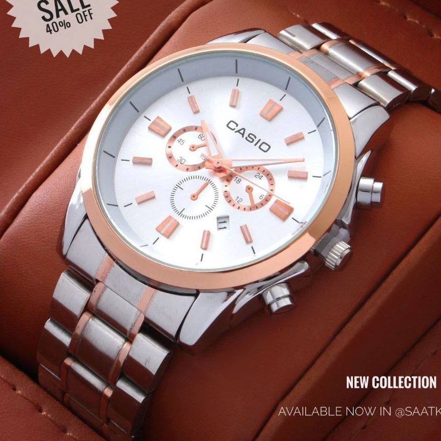 - ساعت مچی مردانه کاسیو Casio طرح سه موتوره صفحه سفید بند دو زنگ استیل+باطری اضافی کد9120