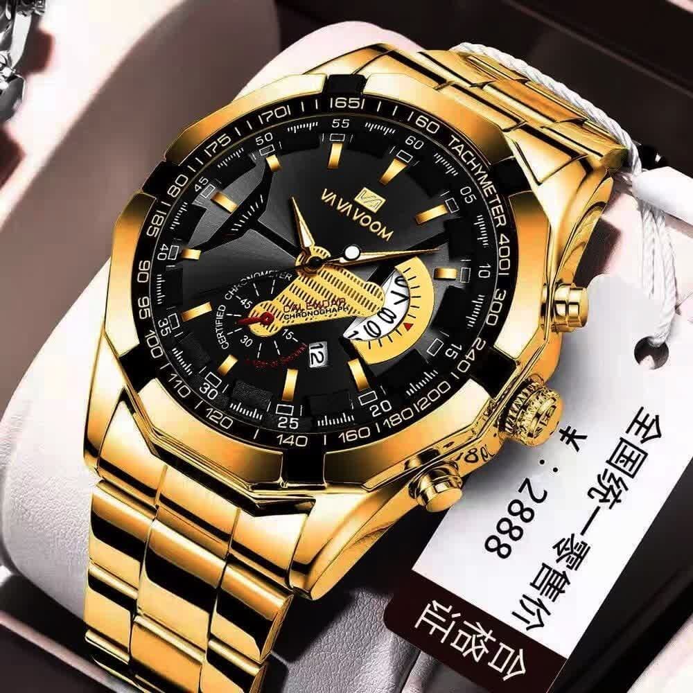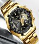 ساعت مچی مردانه بند طلایی استیل صفحه نمایش مشکی طرح 3 موتوره فنجین رنگ ثابت +باطری اضافی کد 9293