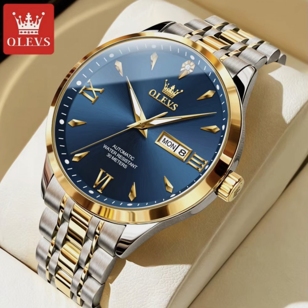 - ساعت مچی مردانه اولوز OLEVS بند استیل دو رنگ طلایی و نقره ایی صفحه نمایش سفید کیفیت عالی+باطری اضافی کد 9311