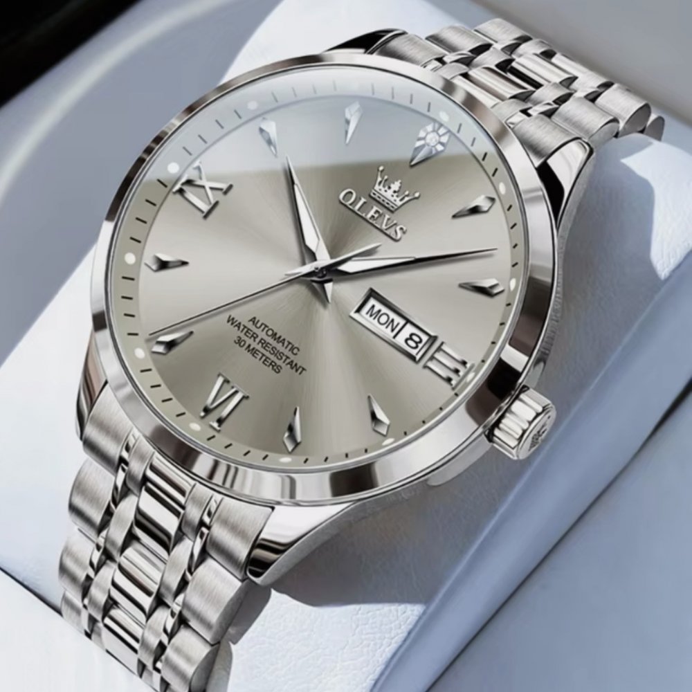 - ساعت مچی مردانه اولوز OLEVS بند استیل نقره ایی صفحه نمایش سفید کیفیت عالی+باطری اضافی کد 9314