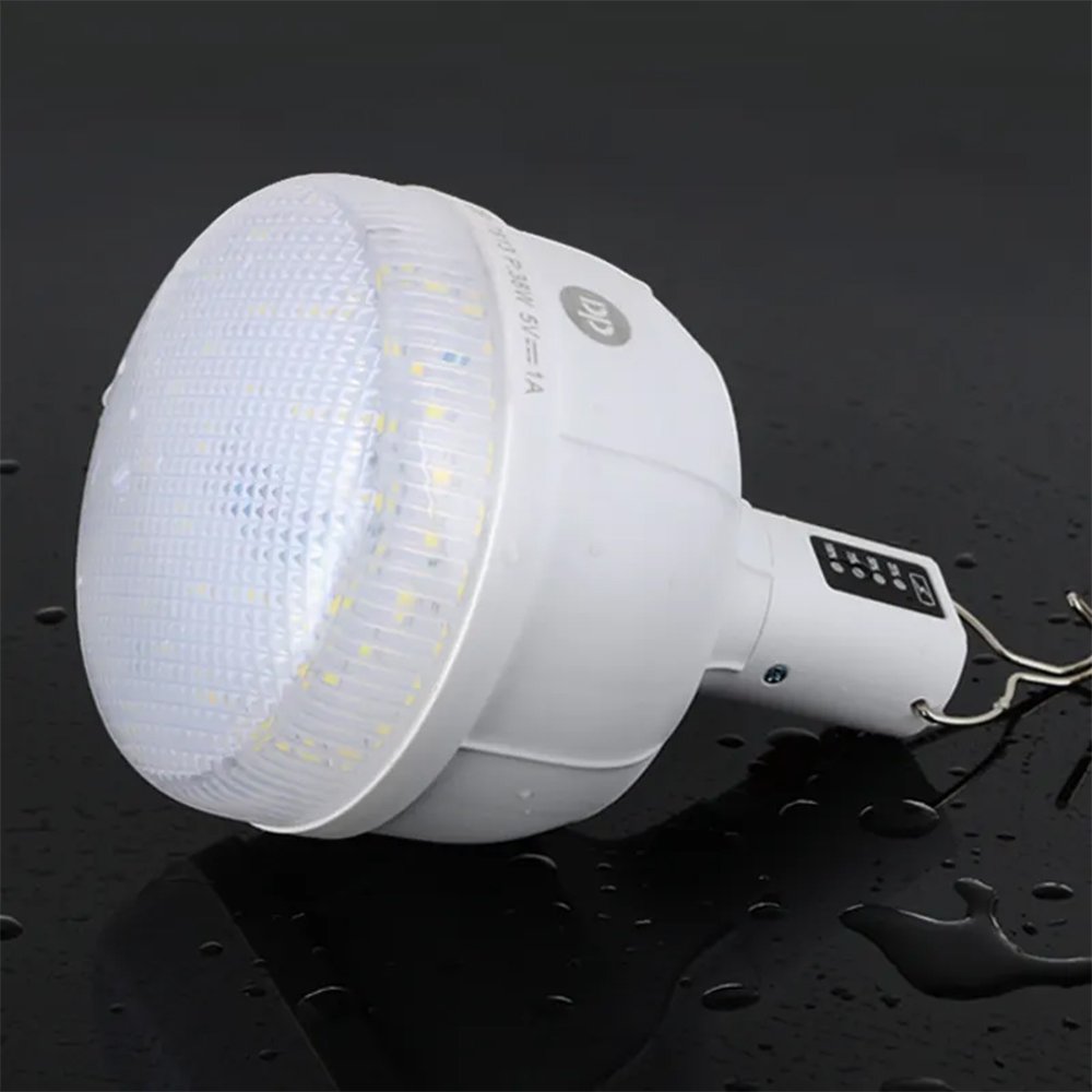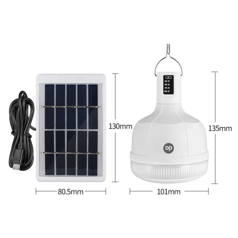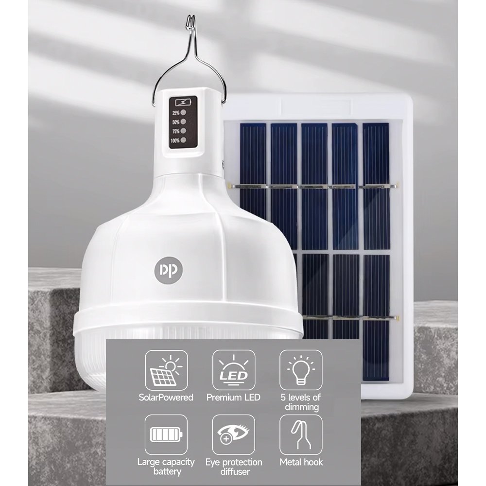 لامپ از نوع استوانه ای ساخته شده از جنس پلاستیک باکیفیت، مقاوم در برابر آسیب های فیزیکی احتمالی همچون فشار،ضربه و ضدآب تامین انرژی از طریق باتری داخلی 18650 با ظرفیت 4000 میلی آمپر ساعت، شارژ مجدد از طرق پورت میکرو یو اس بی و کابل همراه مدت زمان شارژدهی در حالت قوی حدود 3.5 ساعت، متوسط حدود 4.5 ساعت و کم نور حدود 12.5 ساعت مجهز به رنگ نور مهتابی، شدت جریان ورودی 1 آمپر در 5 ولت با توان 38 وات، دارای پنل خورشیدی دارای نشانگر LED جهت نمایش شارژ باقی مانده به صورت درصدی (25%/50%/75%/100%) برخوردار از کلید فیزیکی جهت خاموش/روشن و انتخاب حالت نوردهی، مجهز به آویز فلزی