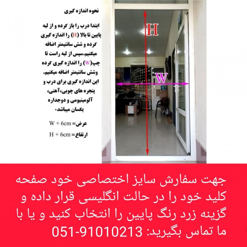 (جهت سفارش سایز اختصاصی این محصول در بالای همین صفحه گزینه (جهت سفارش سایز اختصاصی پرده خود کلیک کنید) را انتخاب و بعد از انتخاب نوع پرده که برای این محصول( پرده توری مغناطیسی مدل اقتصادی ویژه درب)