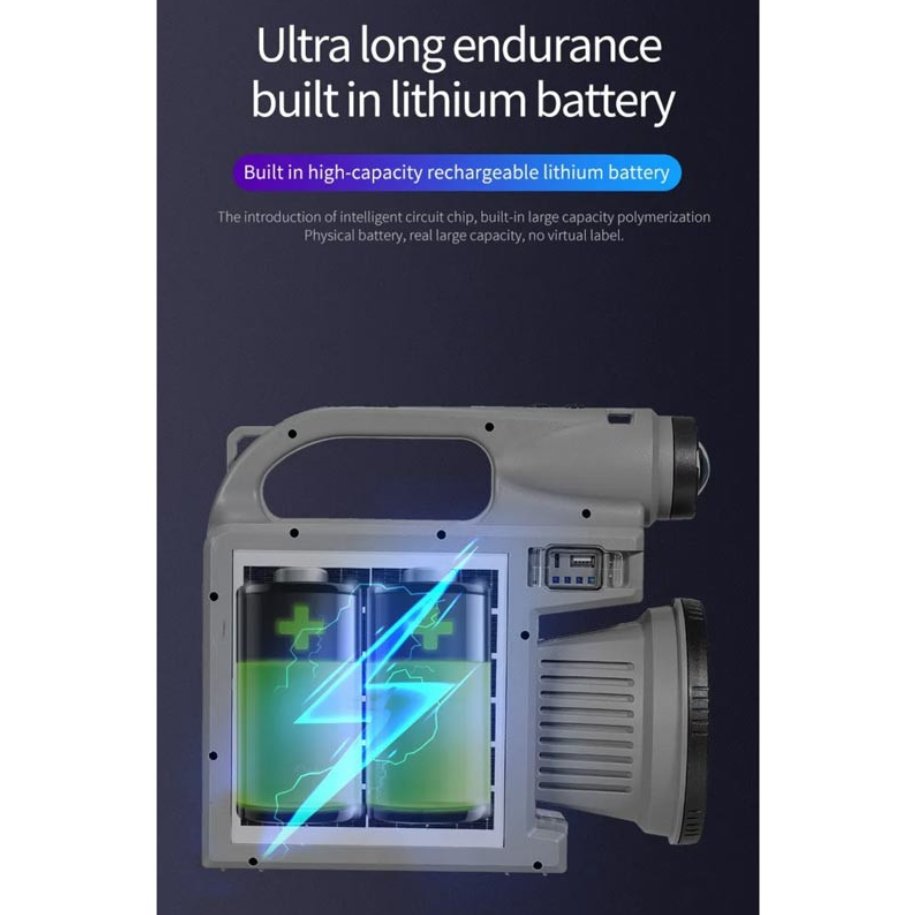 چراغ اصلی با نوردهی مهتابی ثابت قوی، ضعیف و چشمک زن برخوردار از چراغ جانبی با طراحی هیزم و آتش با نوردهی ثابت آفتابی دارای چرغ جانبی با نوردهی آفتابی ثابت، قرمز قوی، متوسط و چشمک زن مجهز به در پوش به منظور جلوگیری از نفوذ گرد و غبار و رطوبت به داخل پورت دارای یک عدد پورت USB به منظور شارژ انواع دستگاه های هوشمند در مواقع ضروری مدت زمان شارژدهی حدود 3 الی 20 ساعت، دارای نشانگر LED جهت نشان دادن وضعیت شارژ چراغ اصلی دارای شار نوری 1800 لومن و چراغ جانبی دارای 2000 لومن برای نور آفتابی و 200 لومن نور قرمز تامین انرژی از طریق باتری لیتیومی داخلی قابل شارژ توسط درگاه Type-C یا پنل خورشیدی تعبیه شده بر روی بدنه بدنه ای مقاوم در برابر ضربه و فشار از جنس پلاستیک ABS، مجهز به دسته و بند جهت سهولت در حمل و نقل محصول