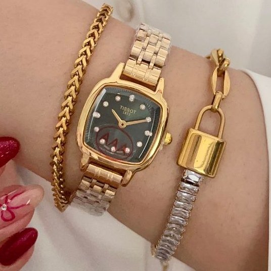 - ساعت مچی زنانه تیسوت TISSOTبند استیل طلایی صفحه مربعی سبز+باطری اضافی کد 9424