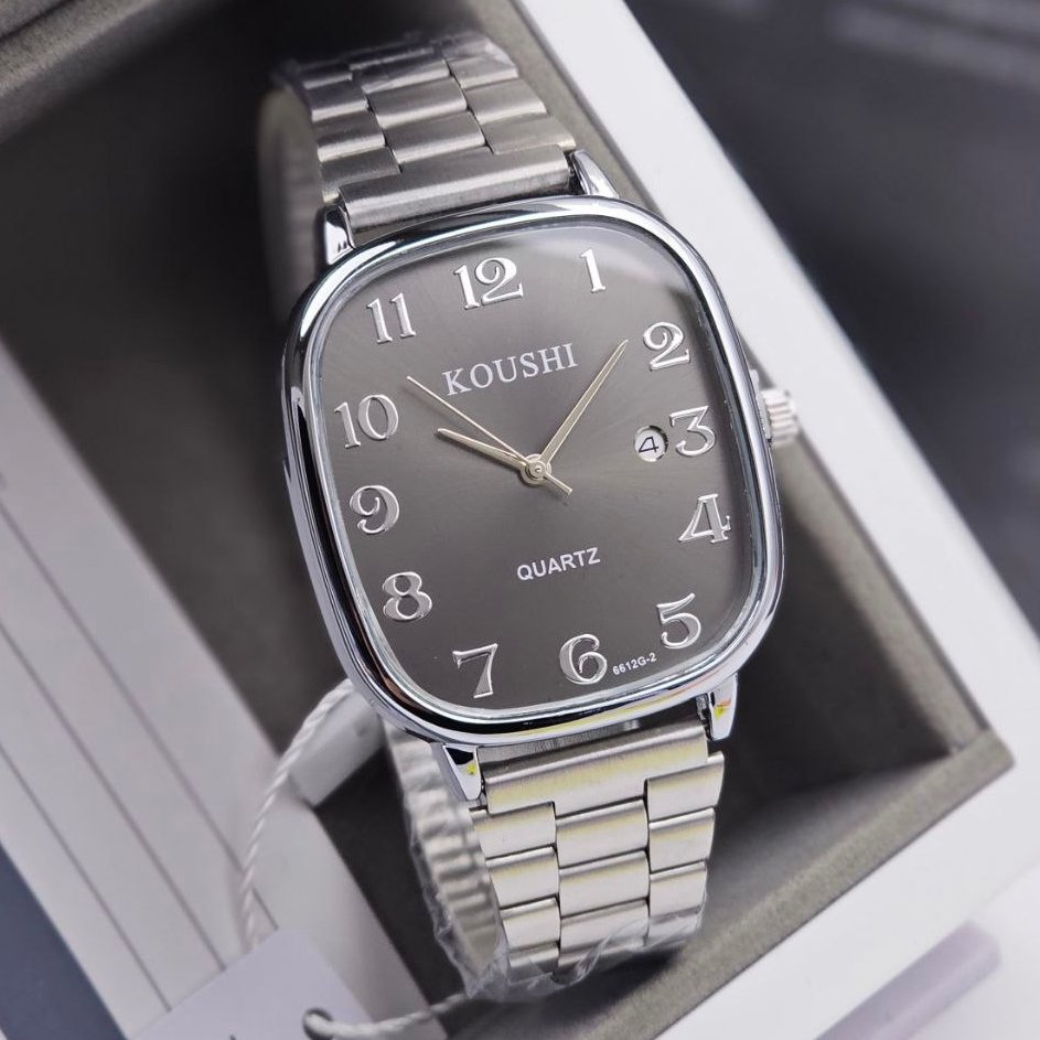 - ساعت مچی مردانه شرکتی برند کوشی KOUSHIبند استیل نقره ایی صفحه مستطیلی مشکی+باطری اضافی کد 9442