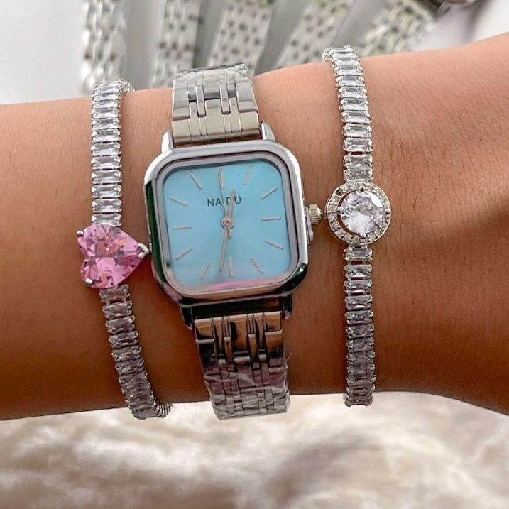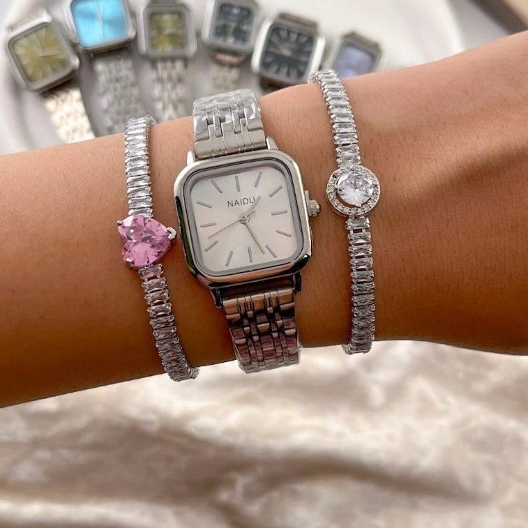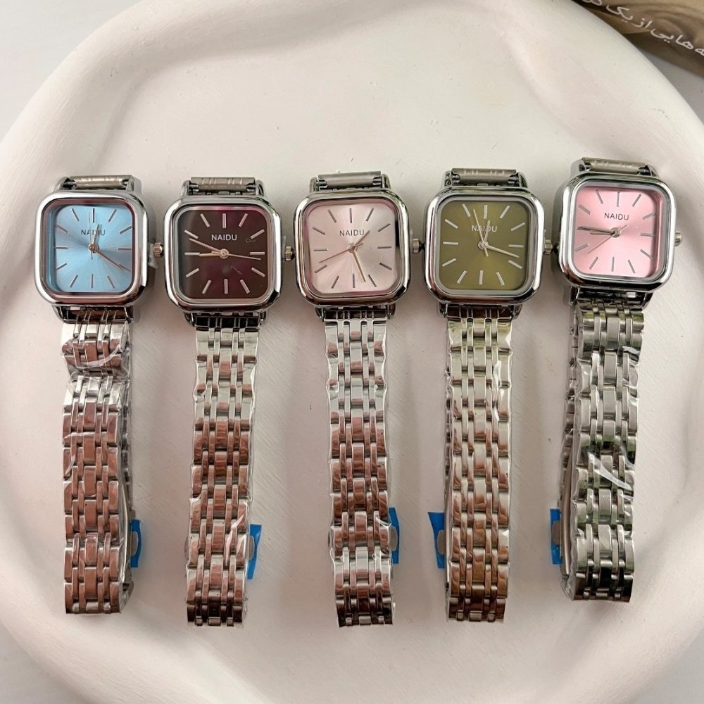 - ساعت مچی زنانه نایدو NAIDU بند حصیری استیل نقره ایی مدل صفحه مربعی صورتی+باطری اضافی کد 9457
